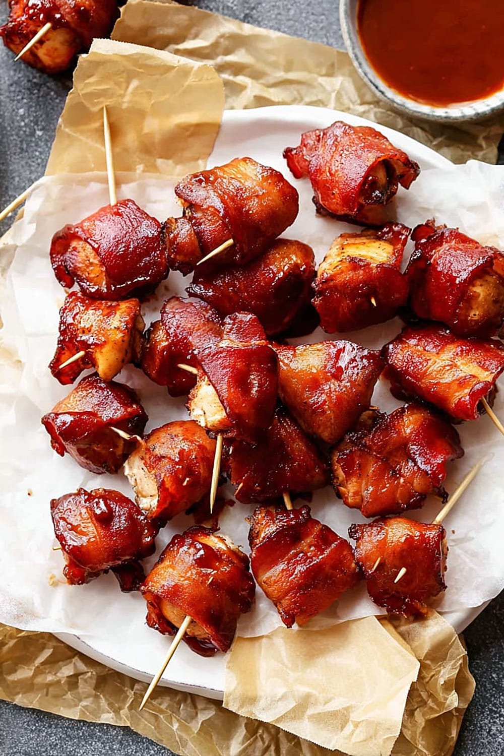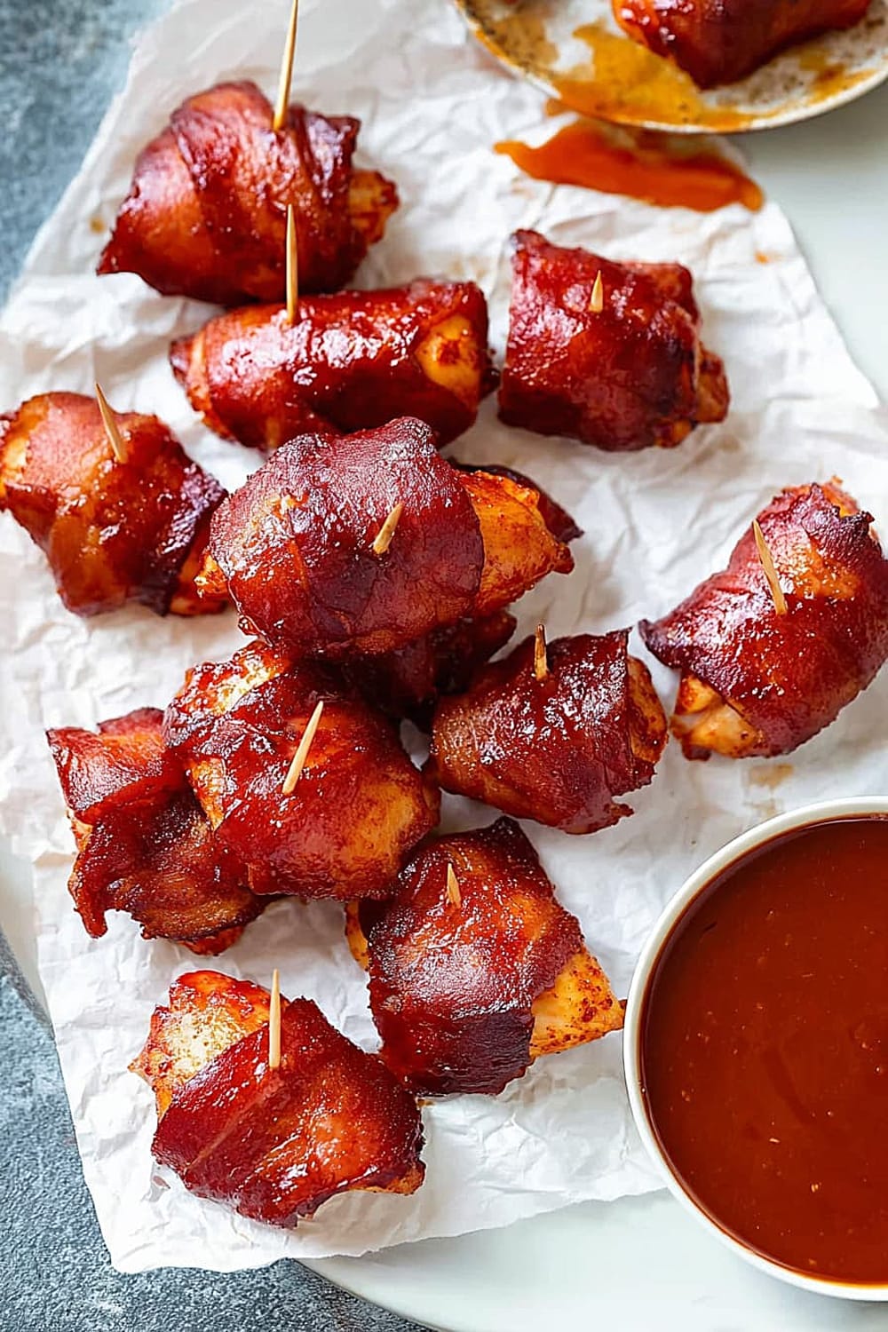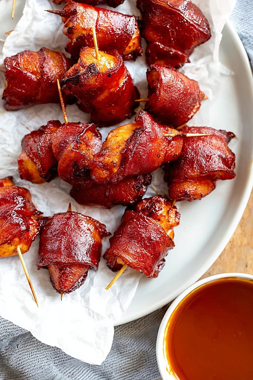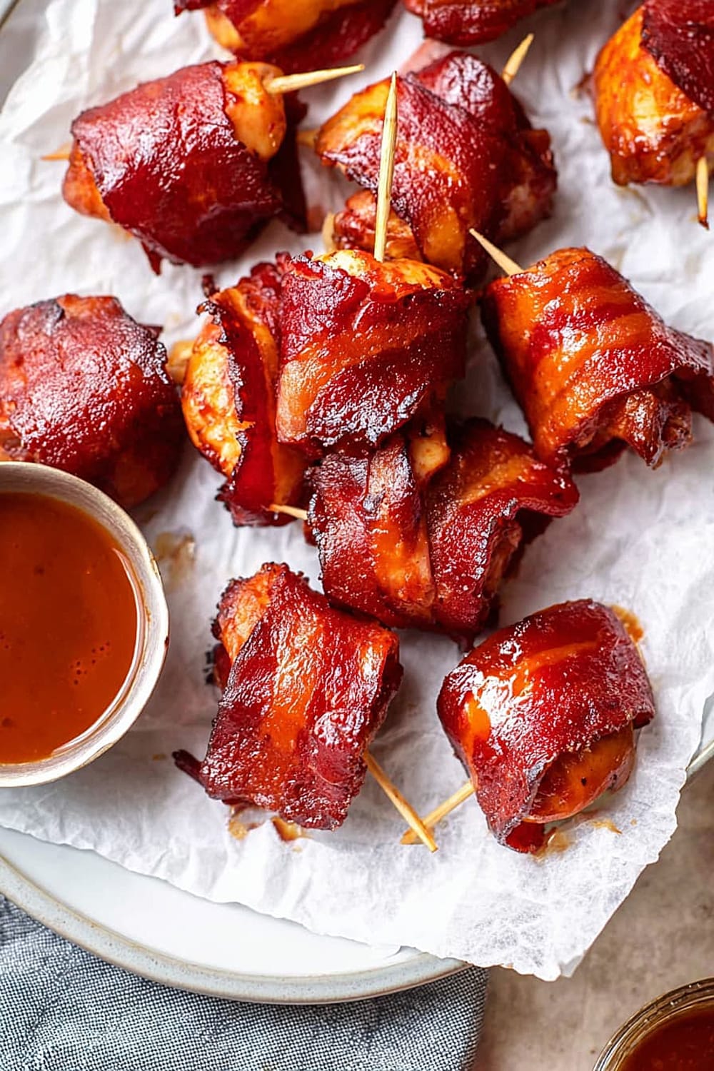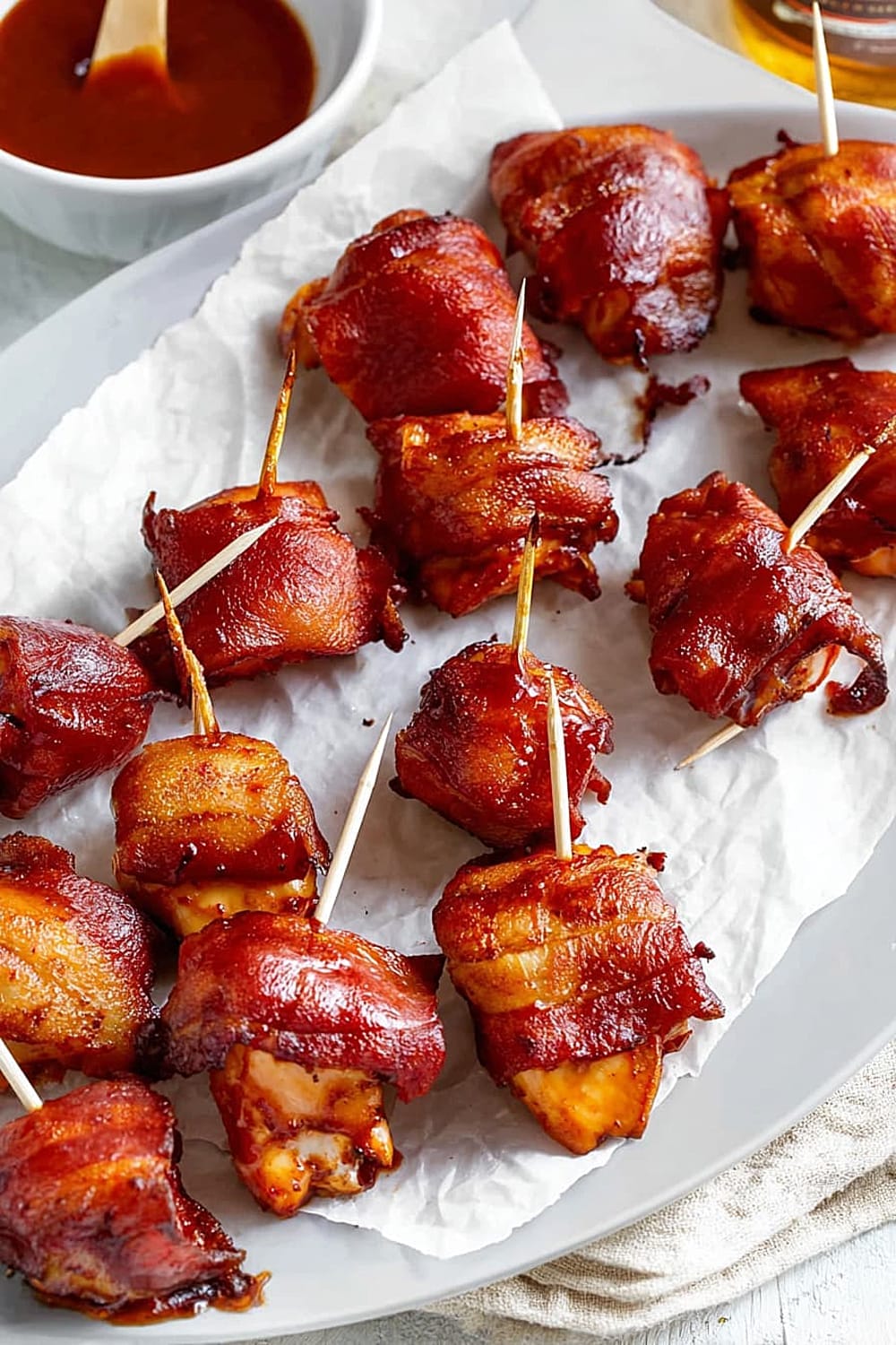 - 10 Let the bites rest for 2-3 minutes before serving to allow the juices to redistribute and the glaze to set slightly. Serve immediately while the bacon is still crispy and the chicken is hot and juicy.