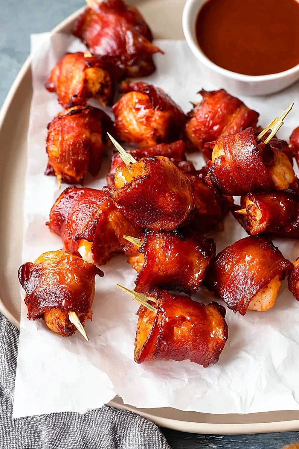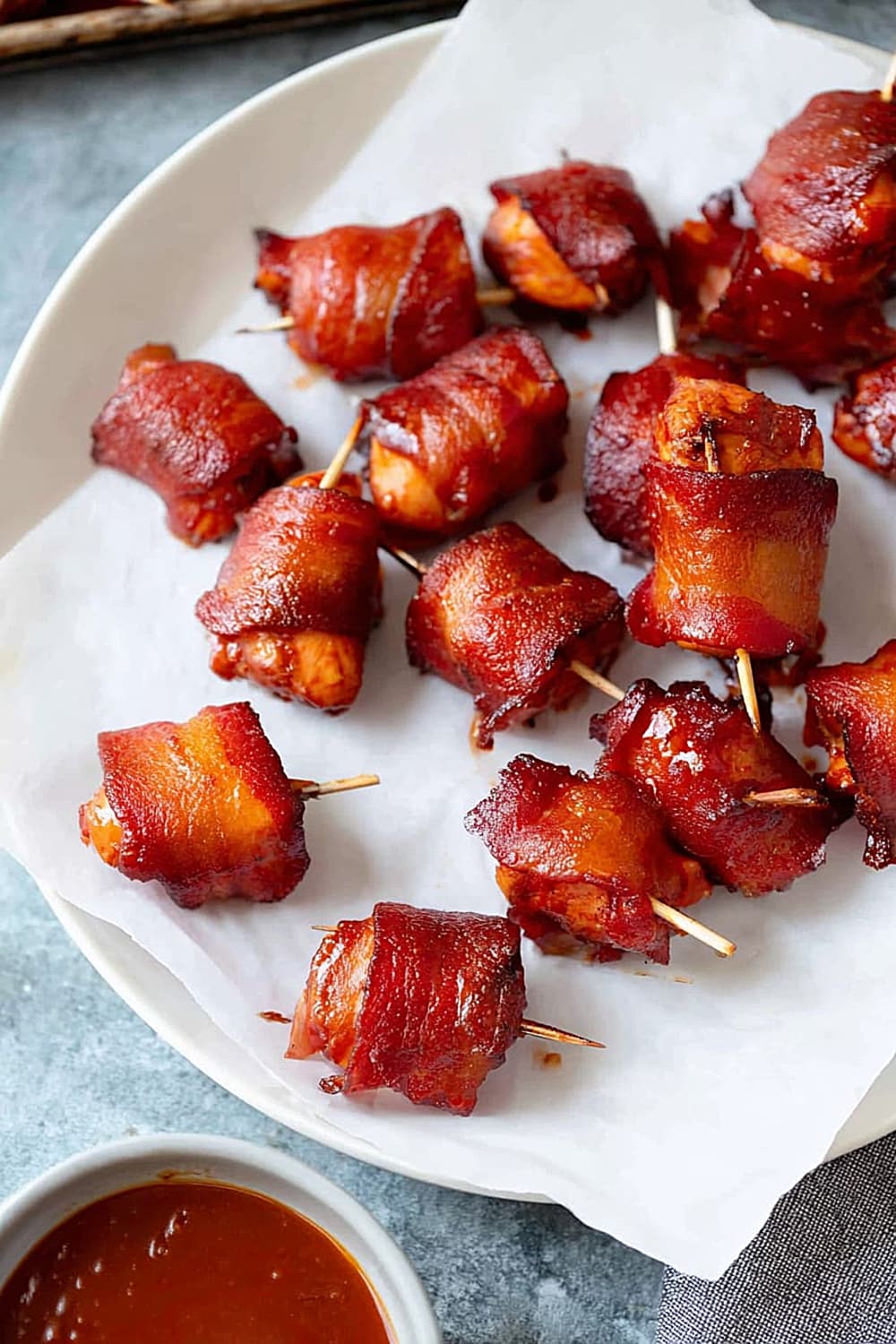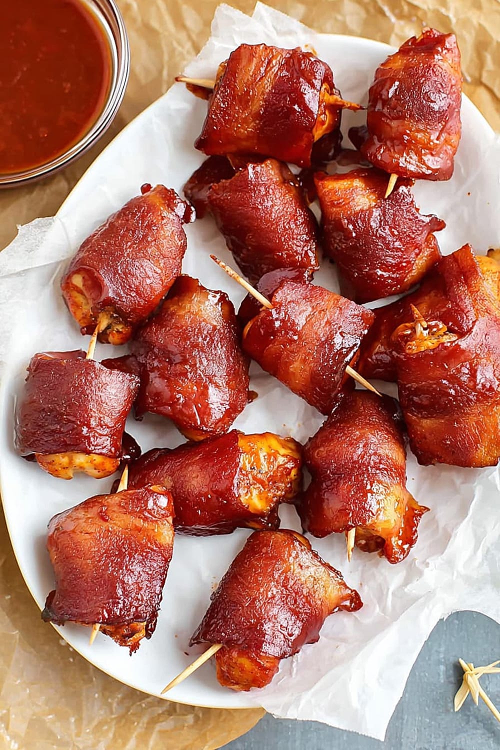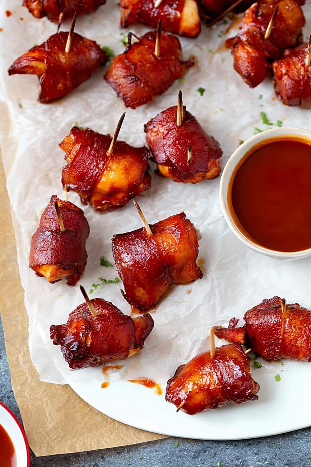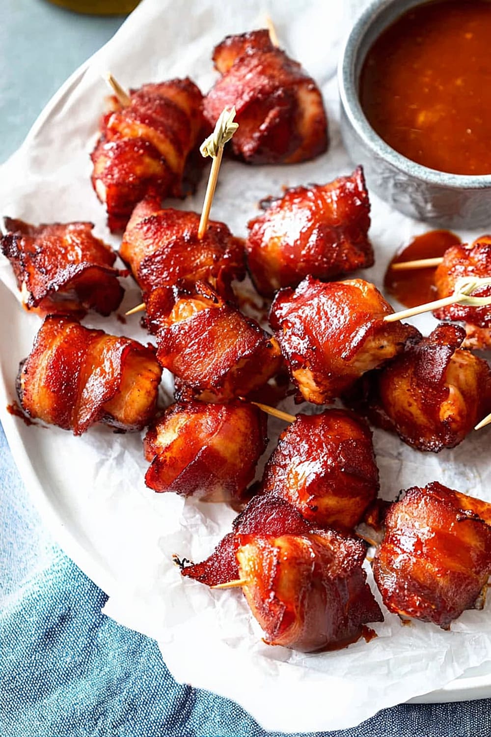 - 10 Let the bites rest for 2-3 minutes before serving to allow the juices to redistribute and the glaze to set slightly. Serve immediately while the bacon is still crispy and the chicken is hot and juicy.