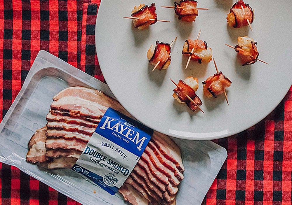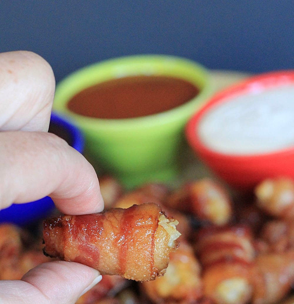 - Silicone-tipped tongs for turning the delicate wrapped tots without damaging the bacon coating