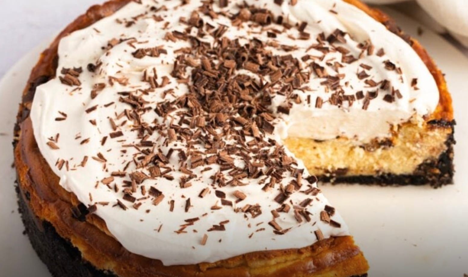 After cooling on the counter, chill the cheesecake overnight in the fridge. Before serving, whip cream with sugar and coffee powder until fluffy. Spread this on top of your cheesecake.