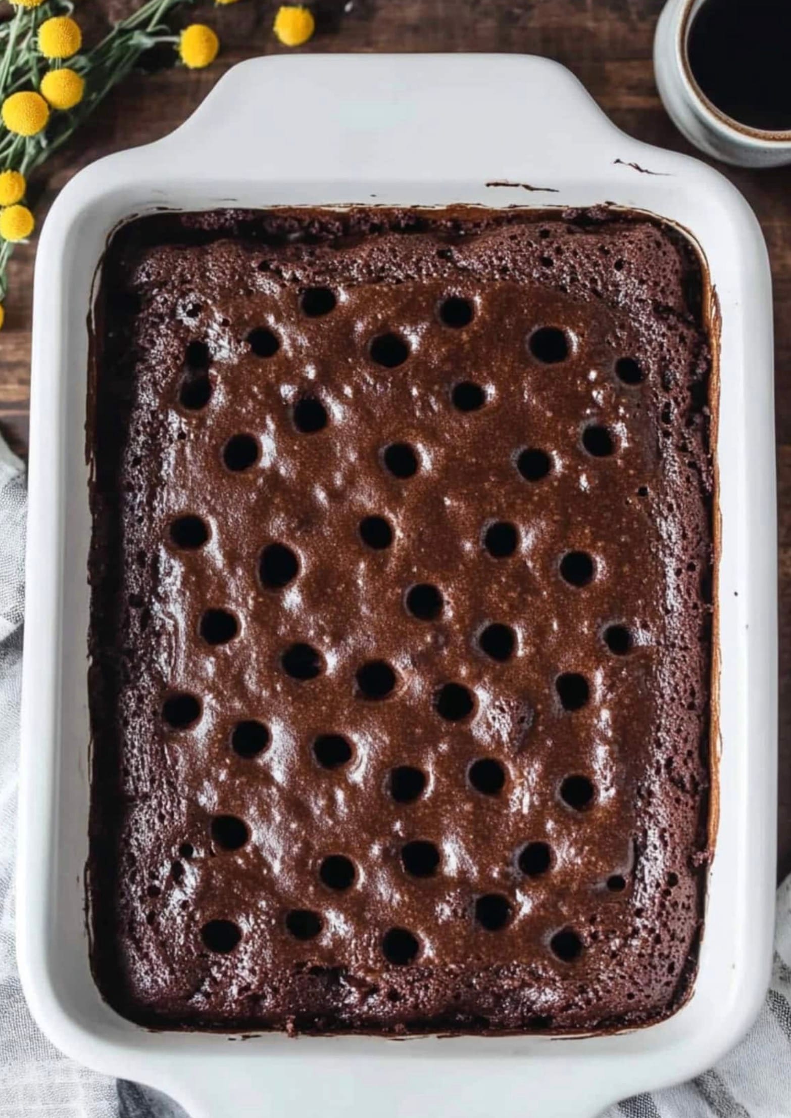 Poke holes all over the cake with a wooden spoon handle. Space them about 1 inch apart and go halfway down.