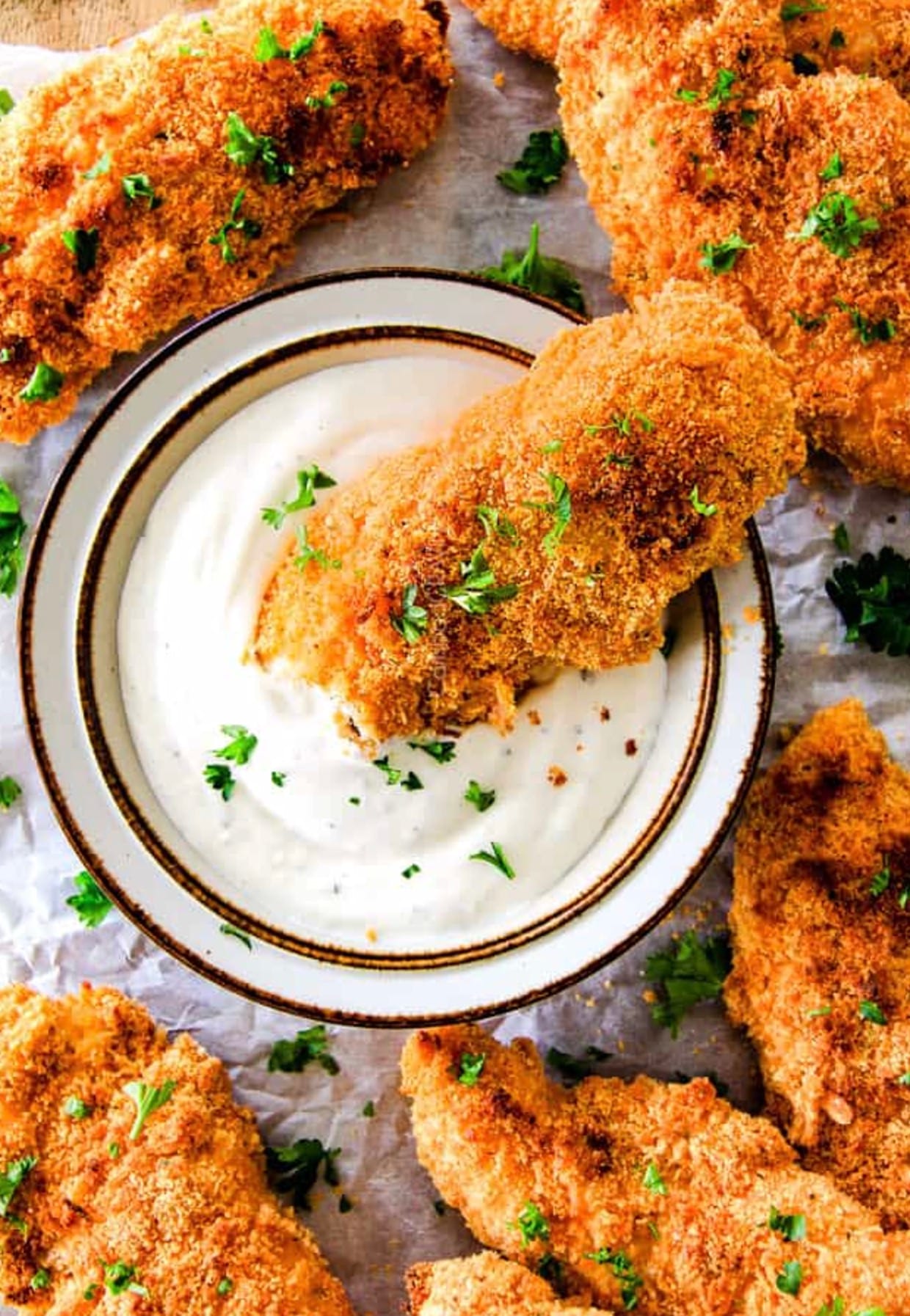 This creamy dip pairs perfectly with your crispy chicken tenders. You can adjust the milk to make it thicker or thinner as you like. The ranch seasoning ties the flavors together with the chicken coating.