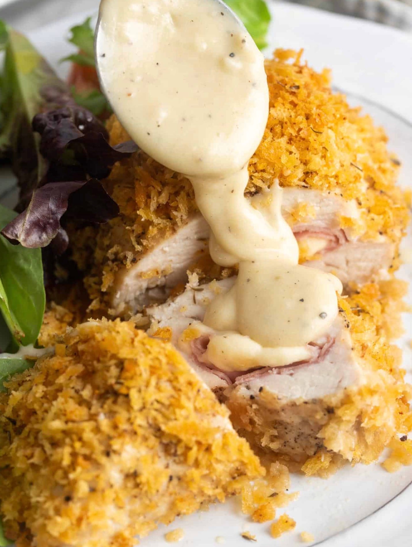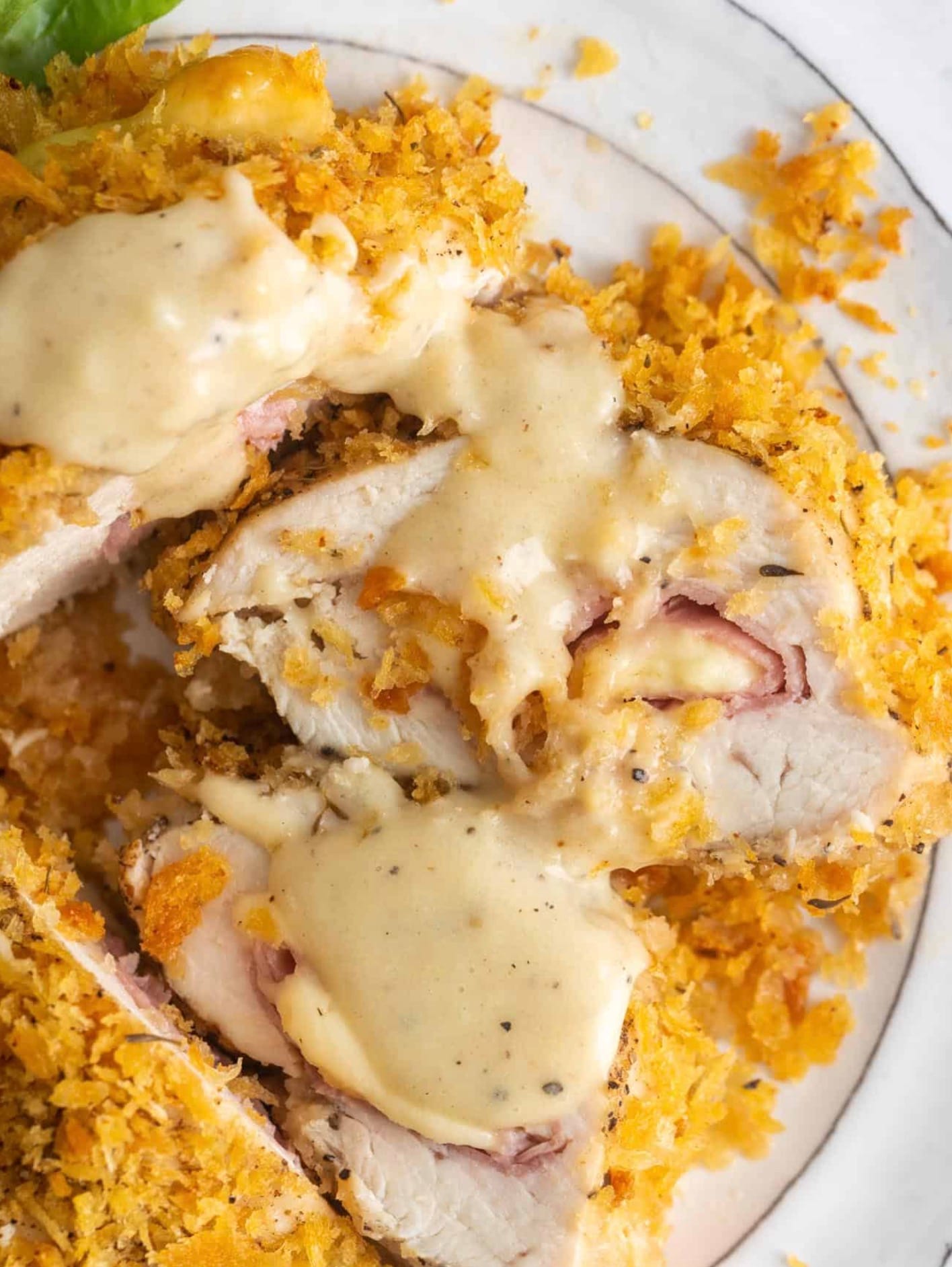 Drizzle the warm sauce over your baked chicken cordon bleu. Enjoy your tasty meal!