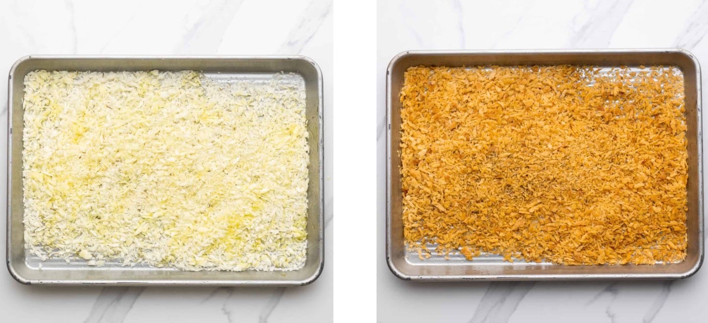 Preheat your oven to 390°F (200°C). Mix panko, garlic powder, onion powder, and thyme on a baking sheet. Spray with oil and bake for 3-5 minutes until golden.