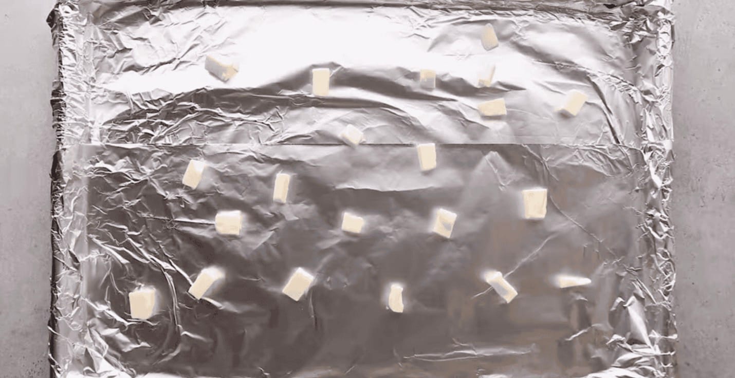 Prep the Baking Sheet: Preheat oven to 425°F. Line a baking sheet with foil. Dot the foil with the 3 tablespoons of unsalted butter, there is no need to melt it ahead of time but you can if you would like.