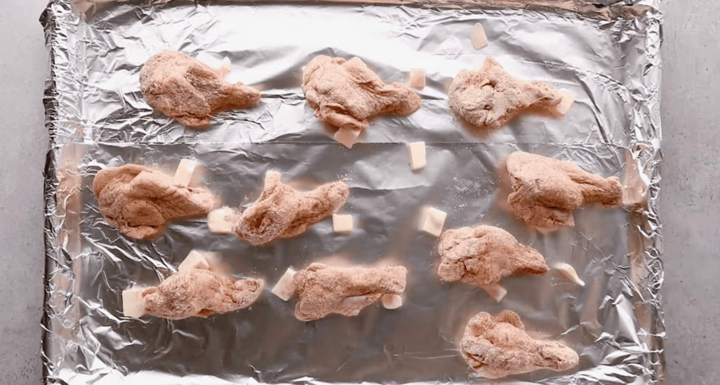 Coat the Wings: Coat both sides of 12 chicken wingettes fully in the flour mixture and place on the baking sheet. Make sure the butter pieces are evenly spaced out among the wings.