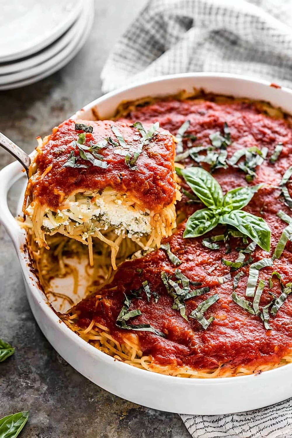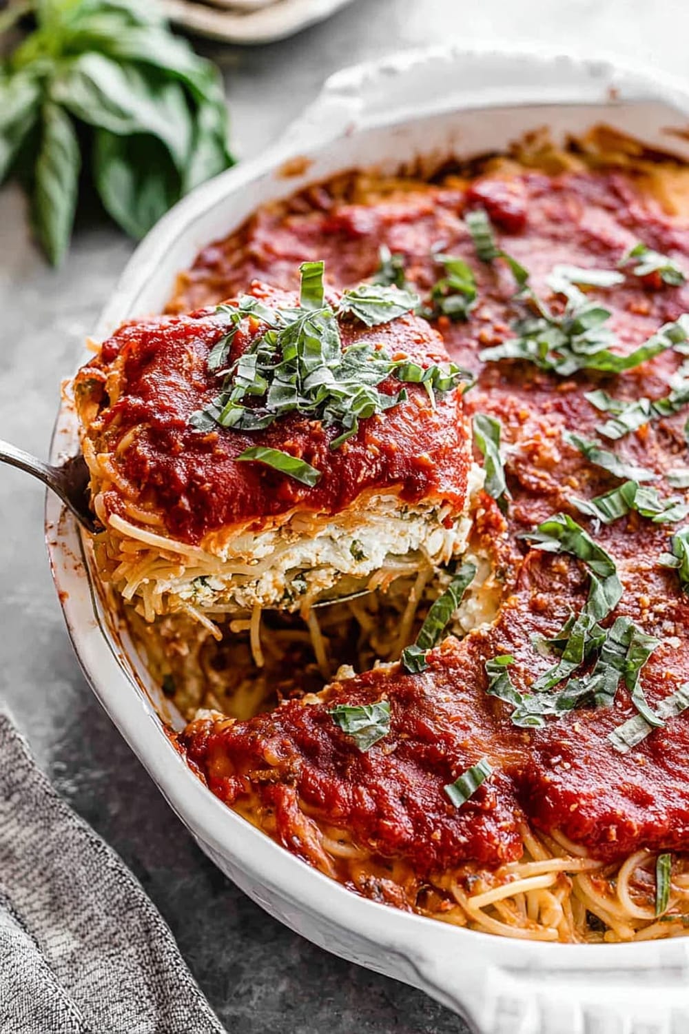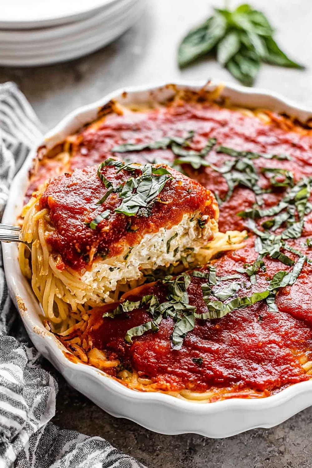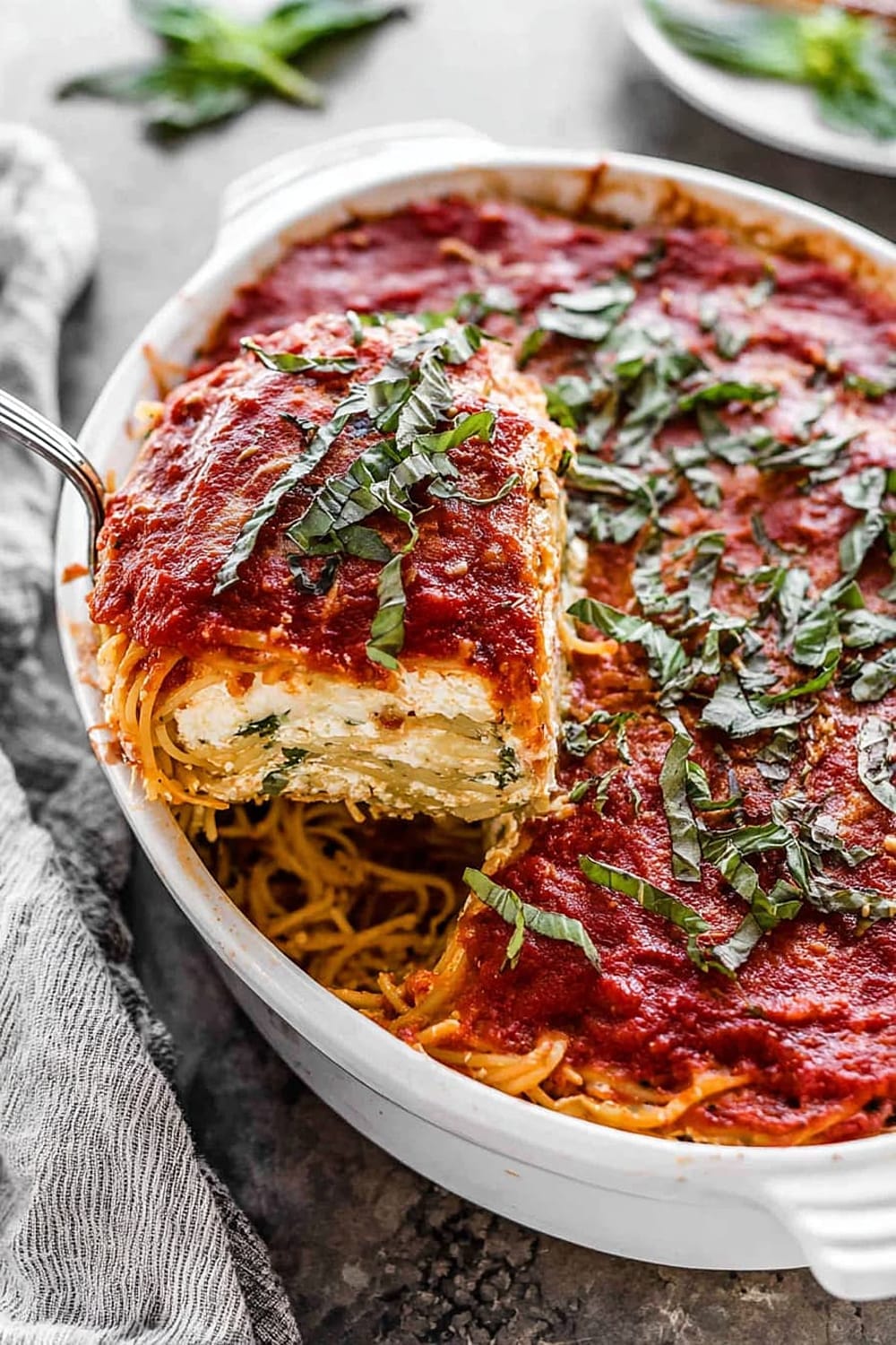Picture this: tender spaghetti noodles mixed with buttery parmesan and fresh basil, forming a golden crust that gives way to creamy cottage cheese and rich marinara sauce.