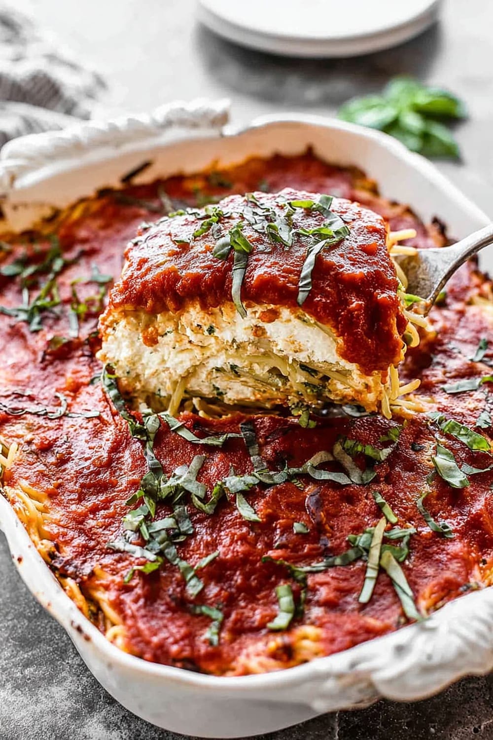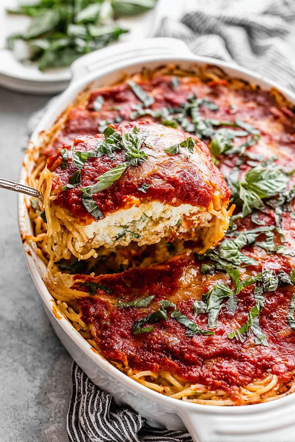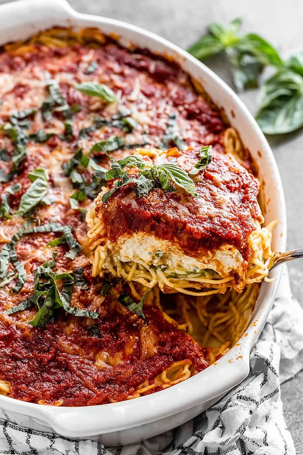Picture this: tender spaghetti noodles mixed with buttery parmesan and fresh basil, forming a golden crust that gives way to creamy cottage cheese and rich marinara sauce.