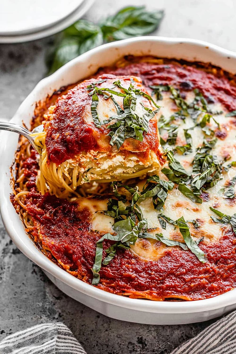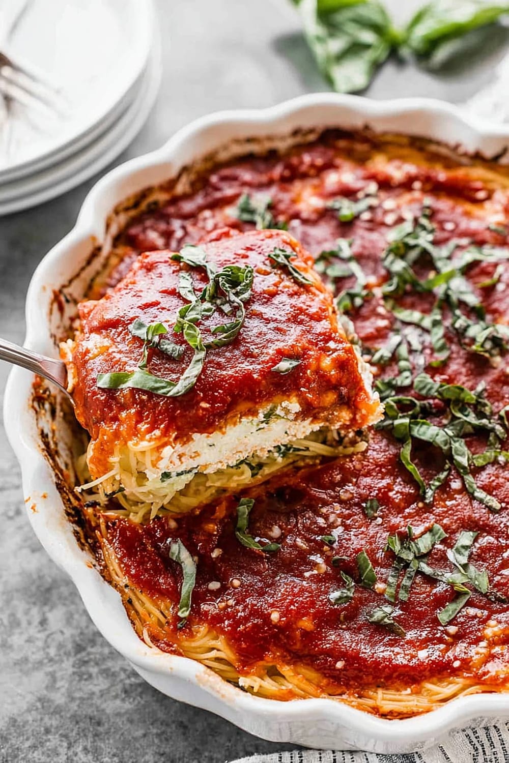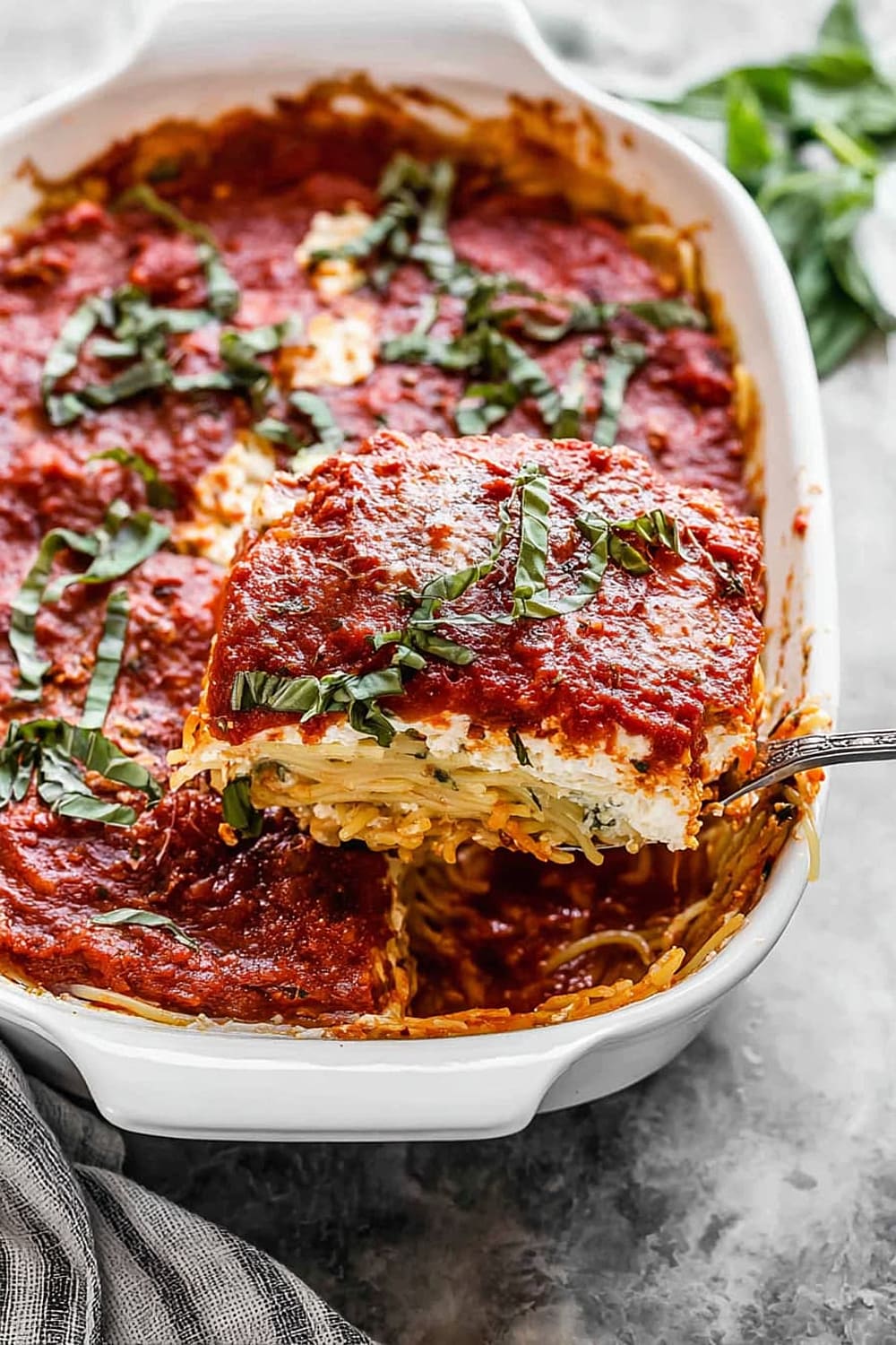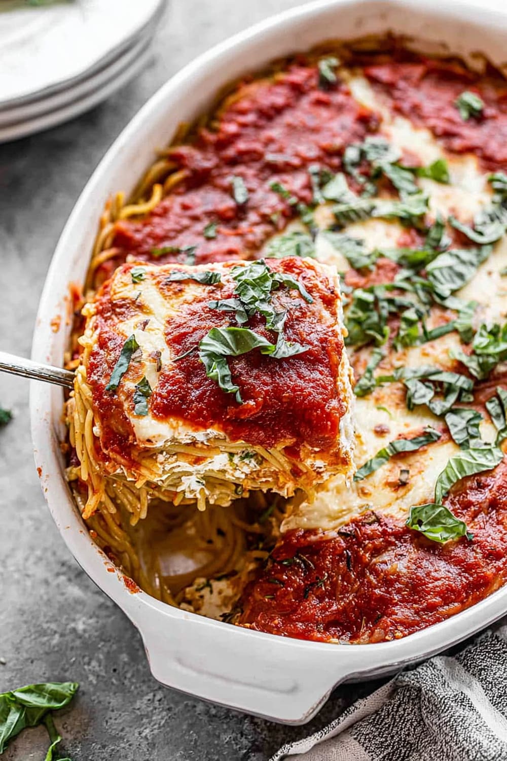 Picture this: tender spaghetti noodles mixed with buttery parmesan and fresh basil, forming a golden crust that gives way to creamy cottage cheese and rich marinara sauce.