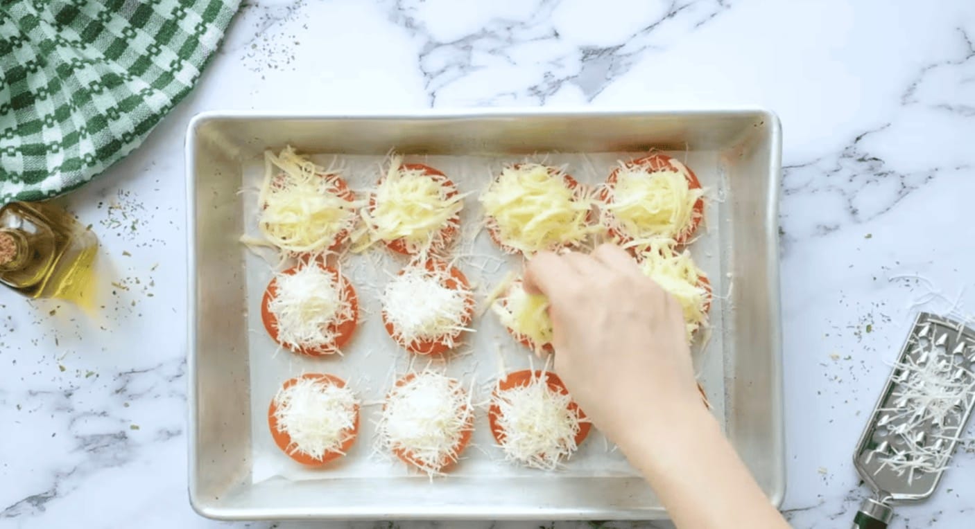 Top with Cheese: Top the tomatoes evenly with 1 cup of freshly shredded Parmesan cheese and 1 cup of freshly shredded mozzarella cheese.