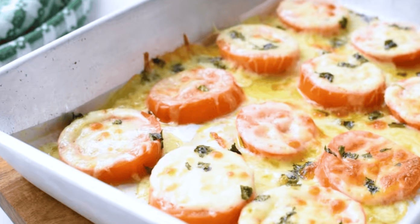 The recipe is super simple. You’ll slice the tomatoes, top them with cheese and basil, and bake until the cheese gets all melty and golden. The warm, juicy tomatoes pair so well with the gooey cheese. It’s a great way to use up fresh tomatoes from your garden or farmer’s market.