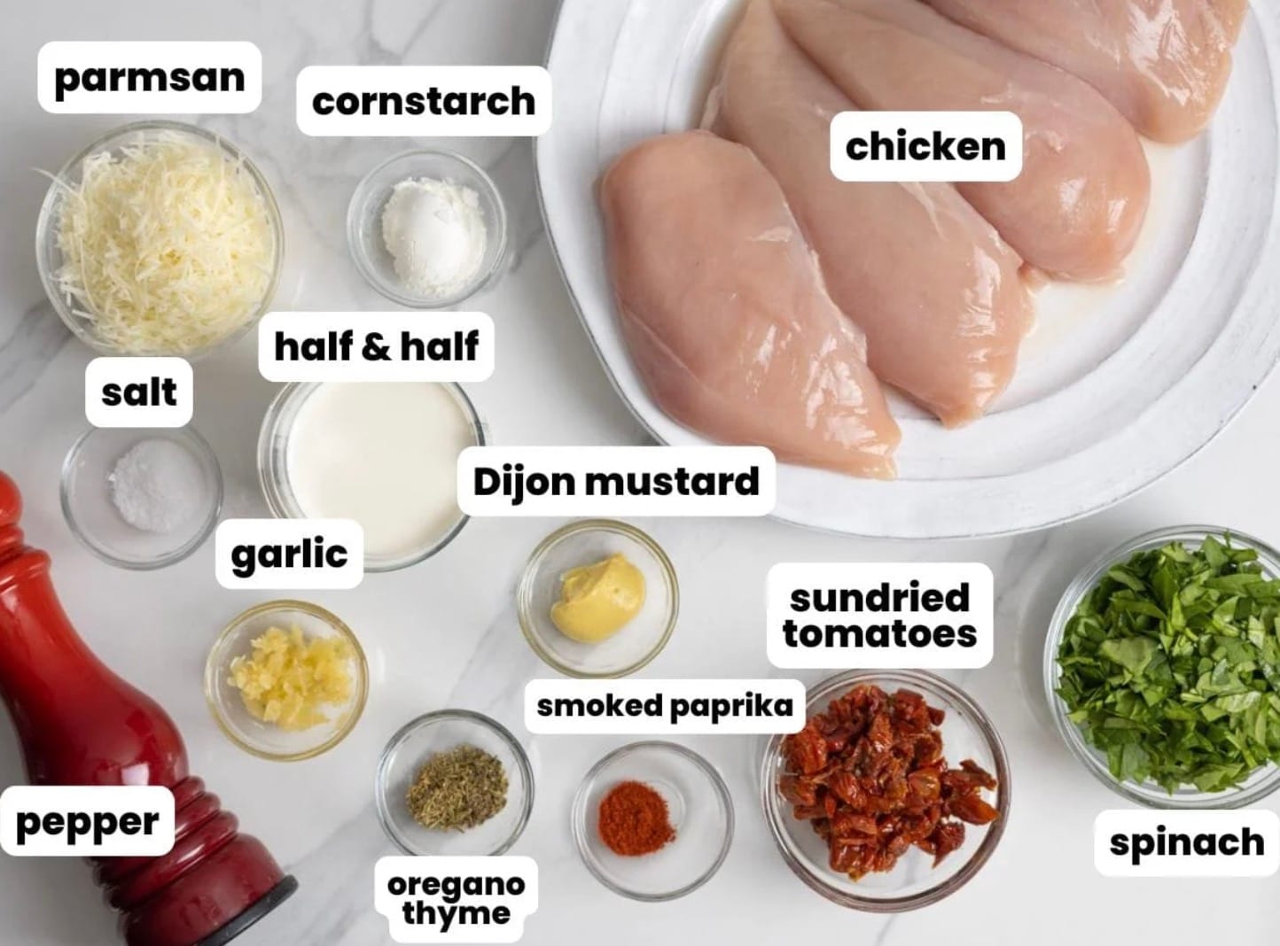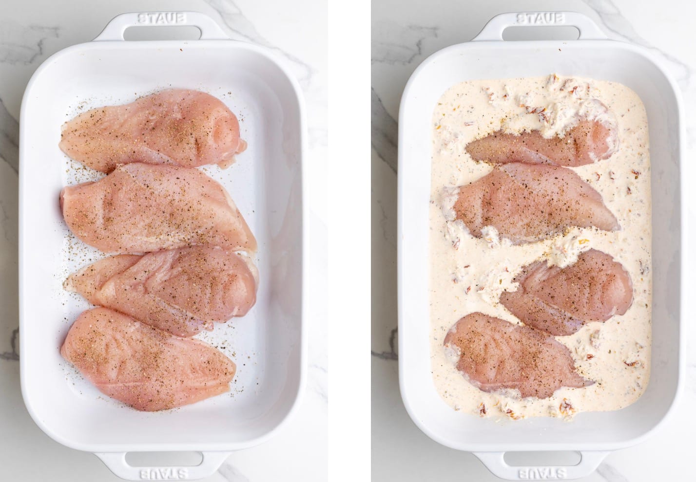This Baked Tuscan Chicken recipe uses simple ingredients to create a flavorful, creamy dish. You’ll need items for the sauce and the chicken itself.