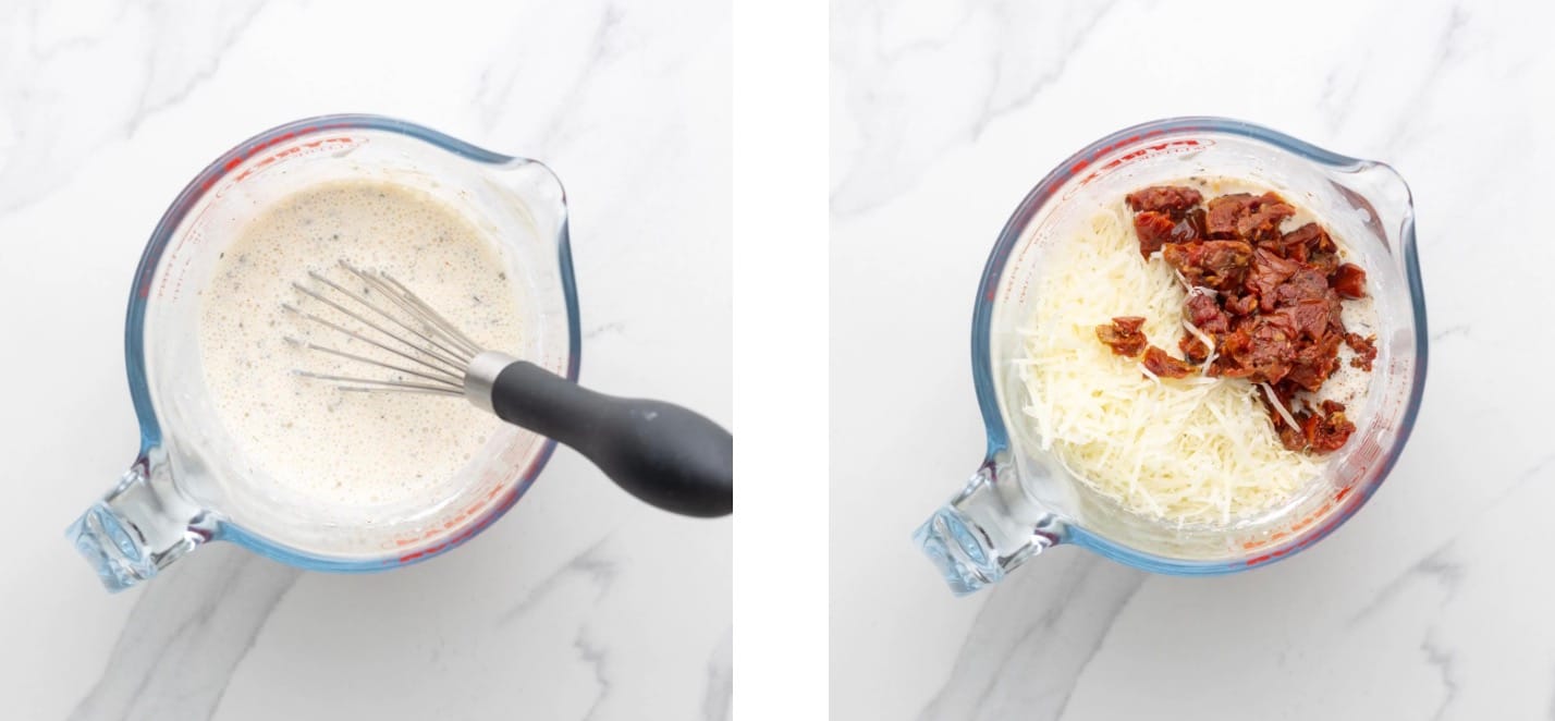 Mix these items in a bowl or jug. The half and half gives the sauce its creamy base, while the herbs and spices add flavor. Cornstarch helps thicken the sauce as it bakes.