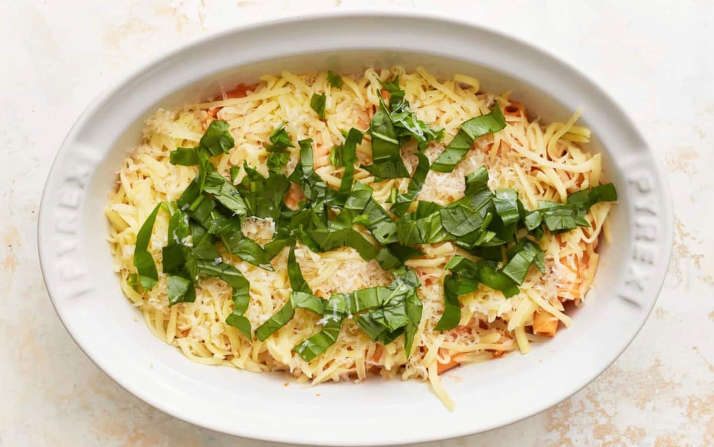 You’ll split the mozzarella, Parmesan, and basil into two parts for layering. Make sure to have your oven preheated to 375°F and an 11×9-inch casserole dish ready.