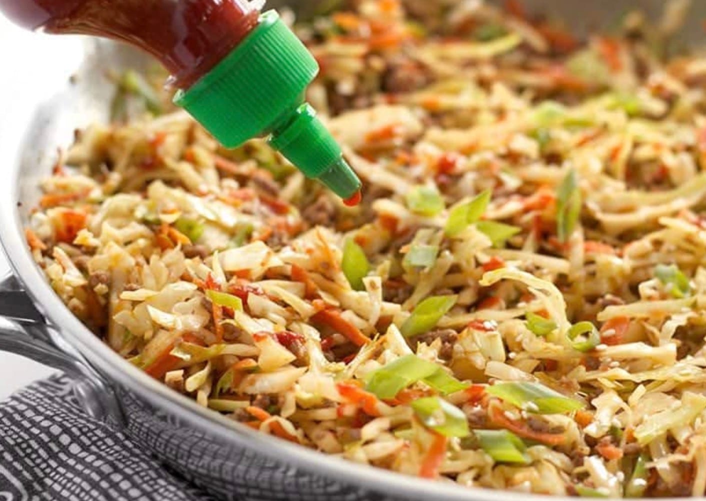 To finish, sprinkle some sesame seeds on top. If you like it spicy, add a bit more sriracha. Your beef and cabbage stir fry is ready to serve!