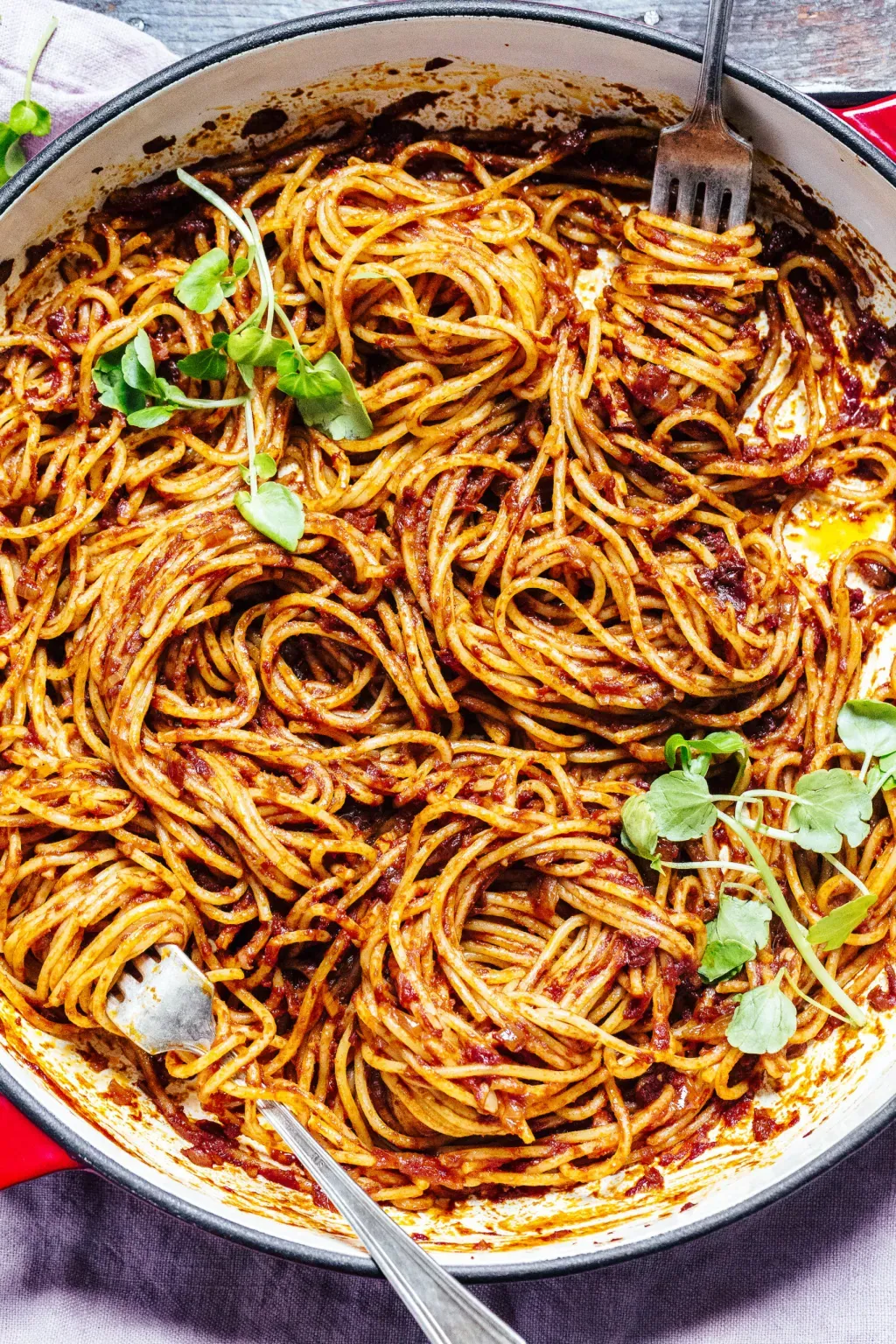 Before draining, save 1 cup of the pasta water. Add cooked pasta to the sauce. Stir well, adding pasta water as needed to thin the sauce.