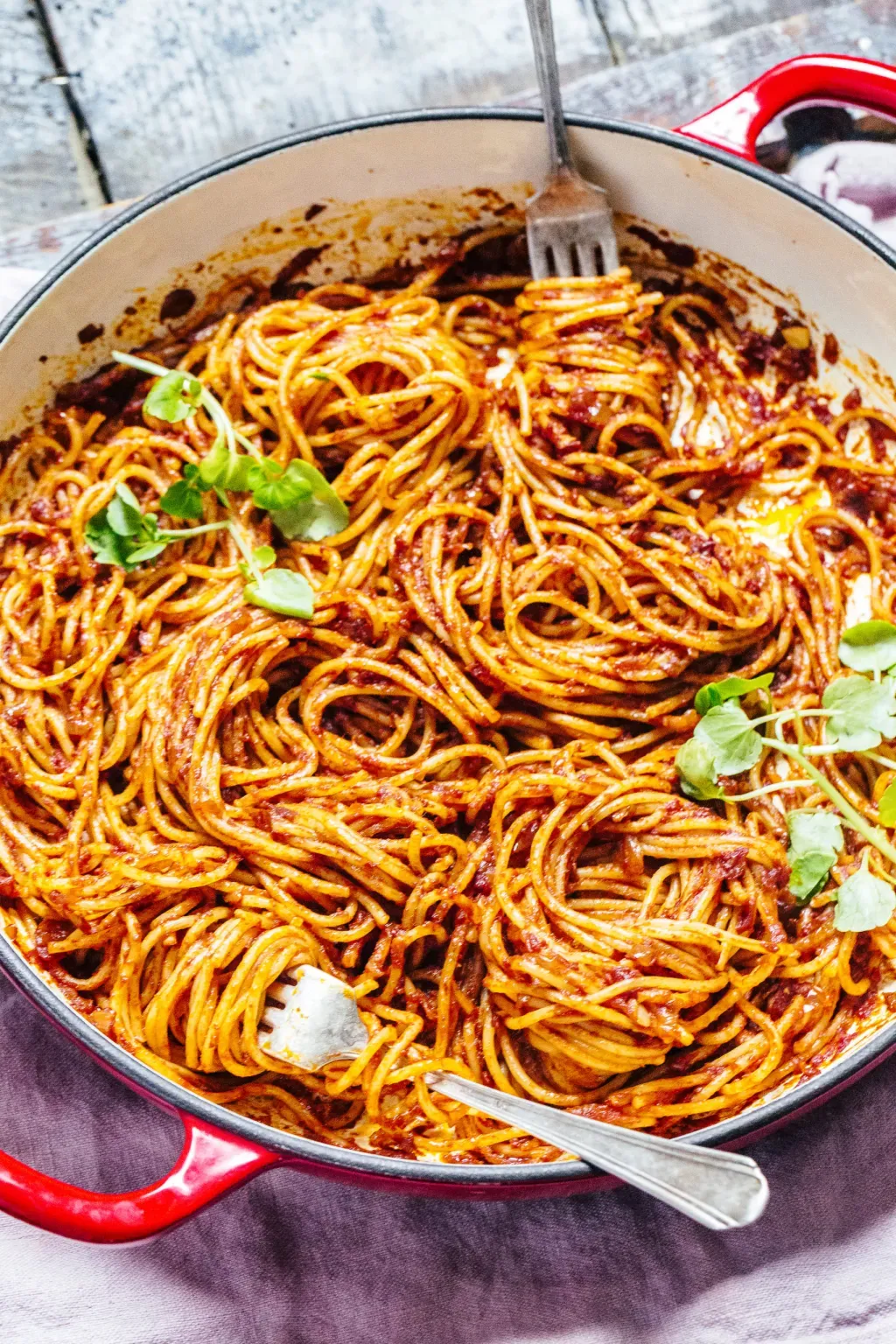 Cook pasta just shy of al dente. It’ll finish cooking in the sauce, absorbing more flavor.