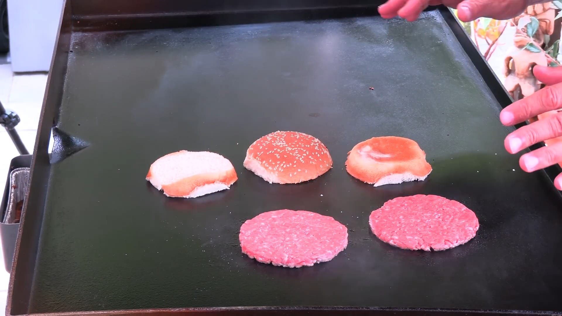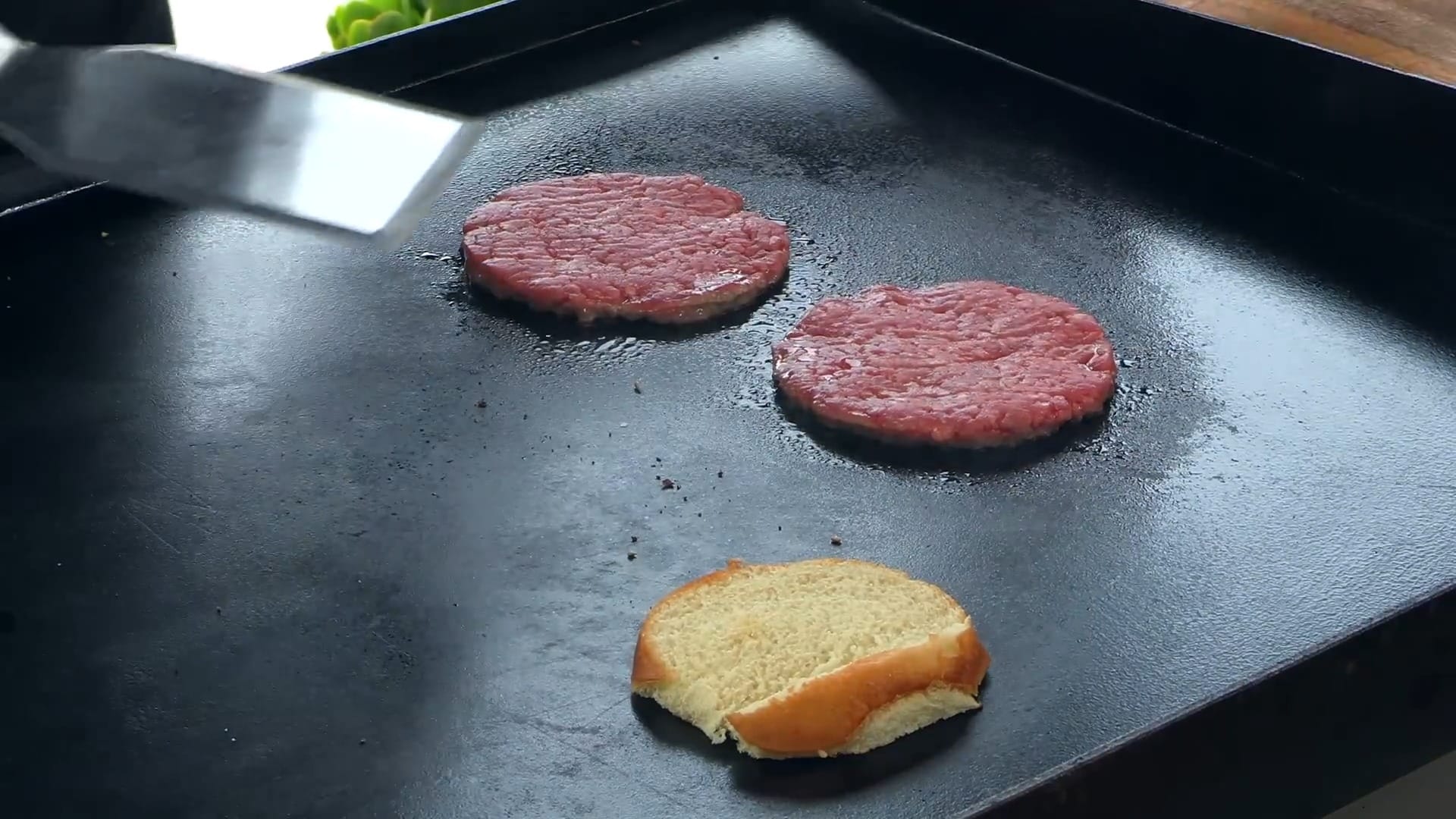 Place the hamburger buns on a preheated griddle or large pan over medium-high heat.