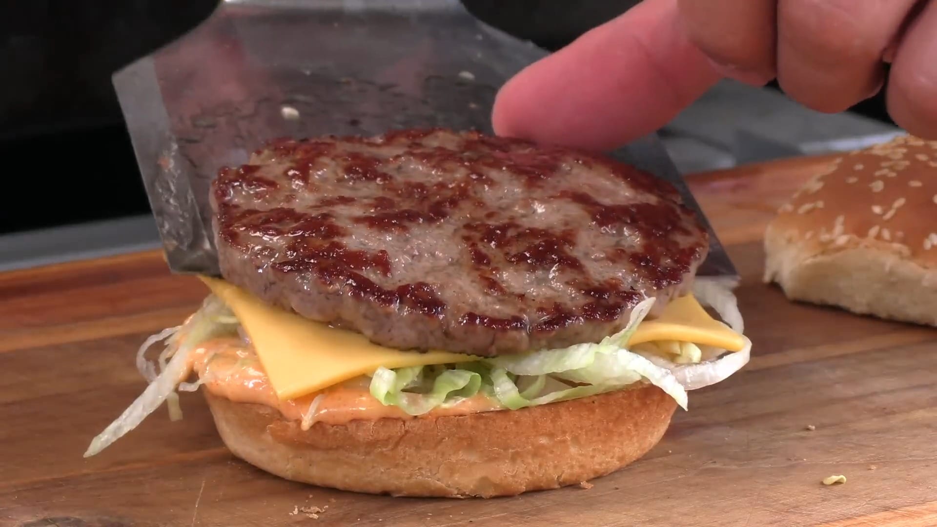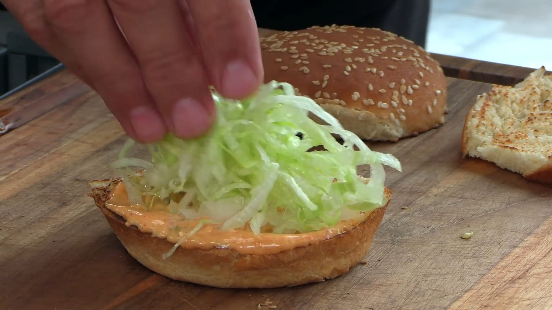 Place the second cooked patty on top of the lettuce.