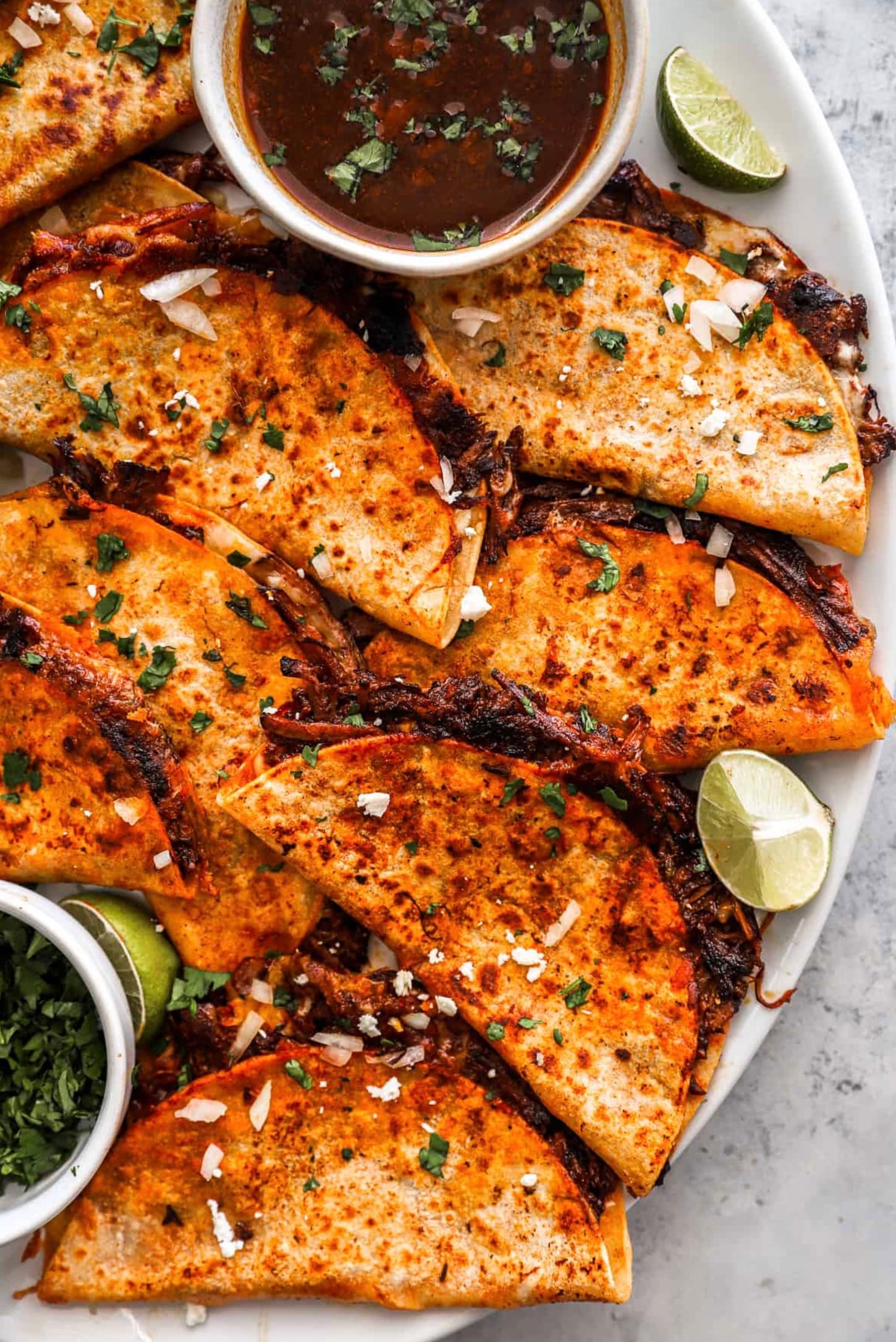 Serve your tasty birria tacos with extra cooking liquid for dipping. Enjoy your homemade Mexican feast!