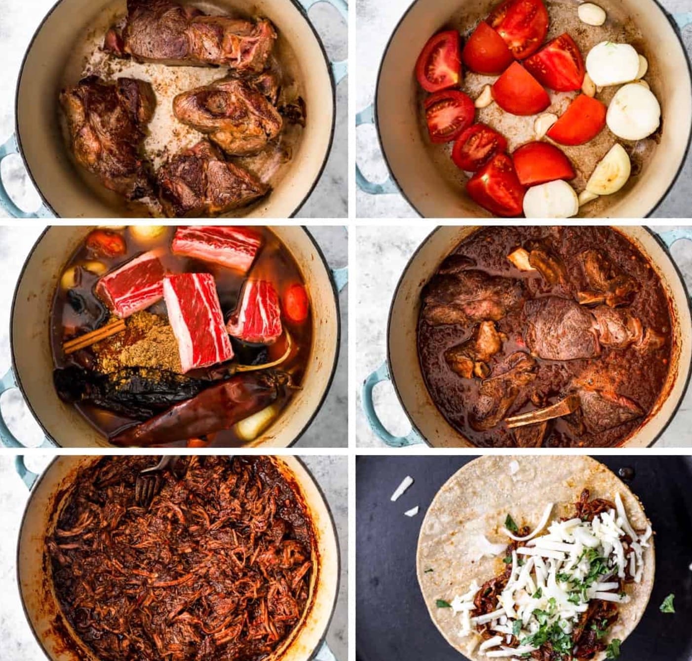 The recipe uses a mix of dried chiles, spices, and citrus to create a complex flavor profile. Chuck roast and short ribs are cooked until they’re fall-apart tender. The tortillas are dipped in the cooking liquid before being filled and crisped up on a skillet. This extra step adds even more flavor and a great texture to your tacos.