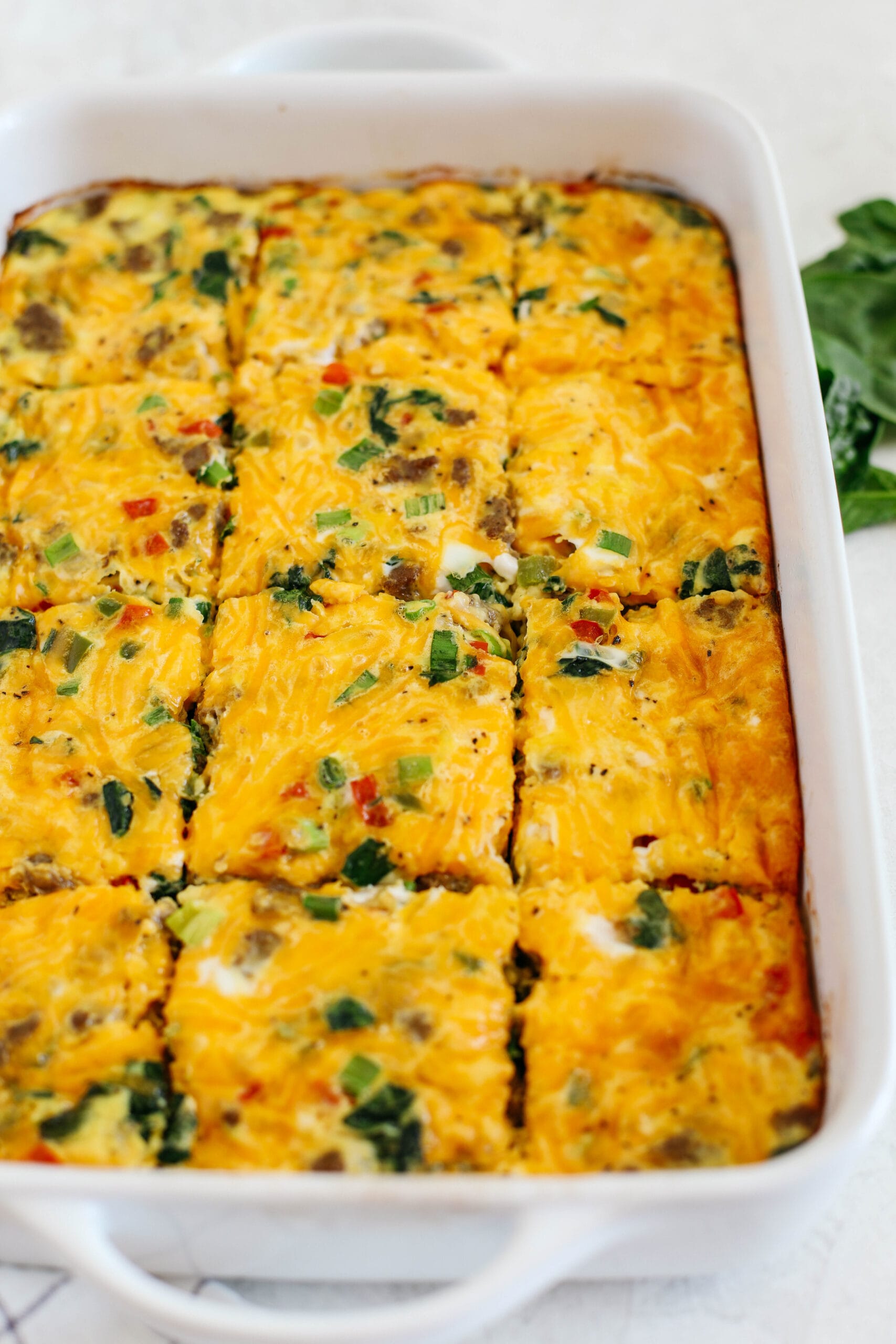 Let the casserole cool for 5-10 minutes before serving. Cut into squares and enjoy your breakfast-for-dinner meal!
