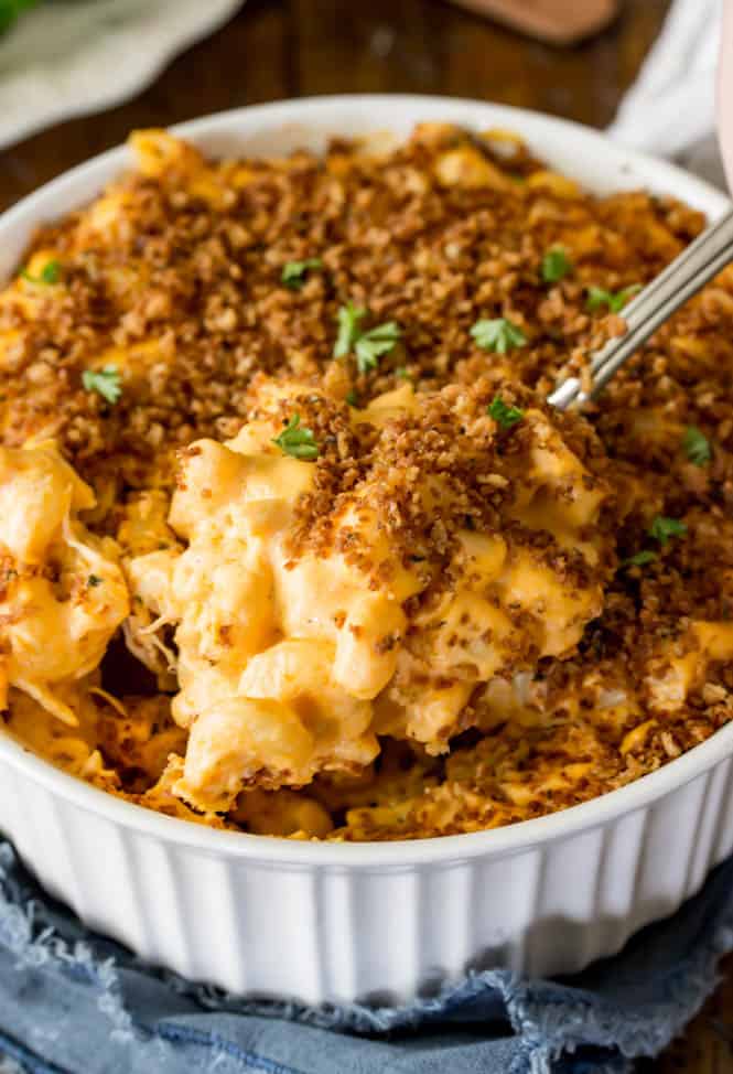 Sprinkle the topping over your mac and cheese. Bake for 15-20 minutes until it’s bubbly and golden.