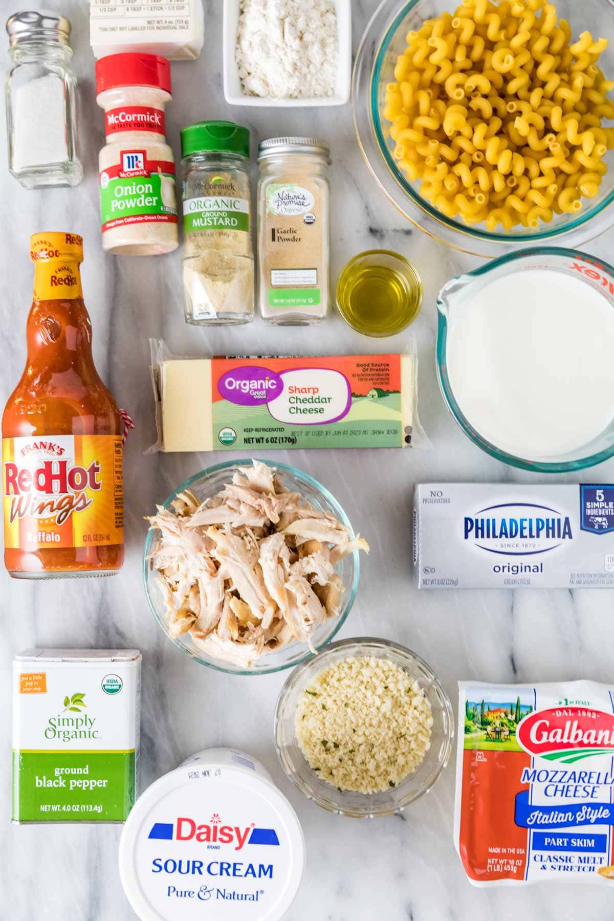 Here’s everything you’ll need to make this tasty Buffalo Chicken Mac and Cheese: