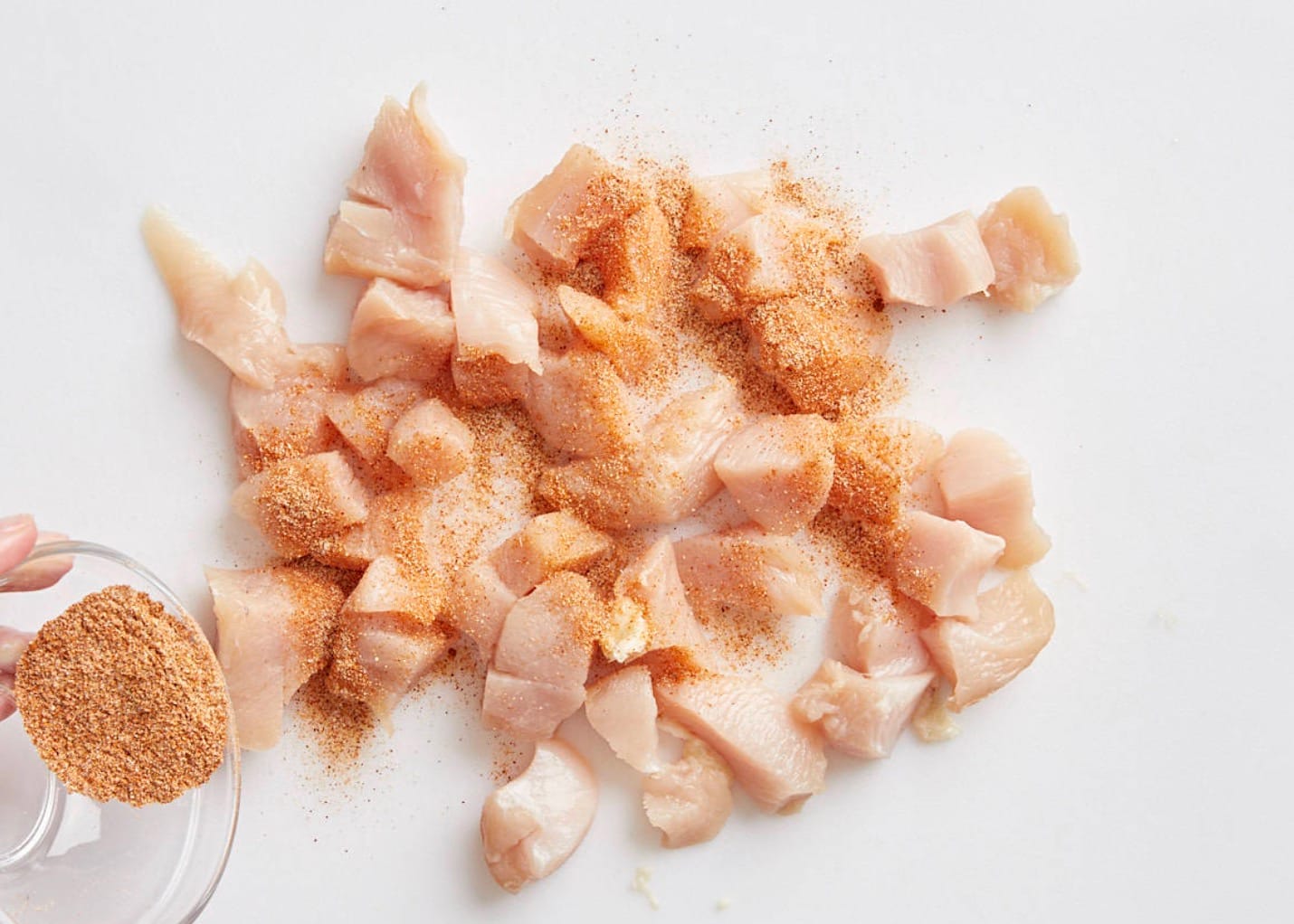 Start by cutting your chicken into bite-sized pieces. Mix garlic powder, onion powder, cayenne pepper, and salt. Coat the chicken with this spice mix.