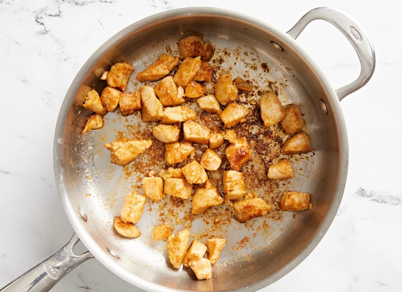 You’ll start by cutting the chicken and mixing the spices. Then you’ll brown the chicken in a skillet.