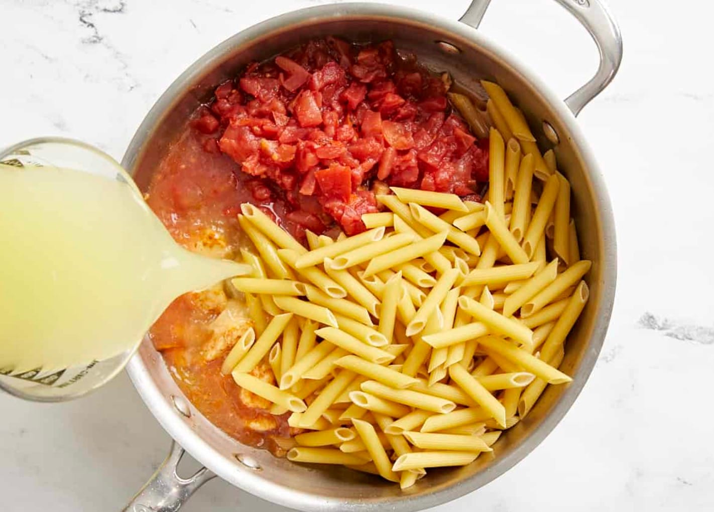 Now, add your pasta, tomatoes, and chicken broth to the skillet. Stir well to get all the tasty bits off the bottom.