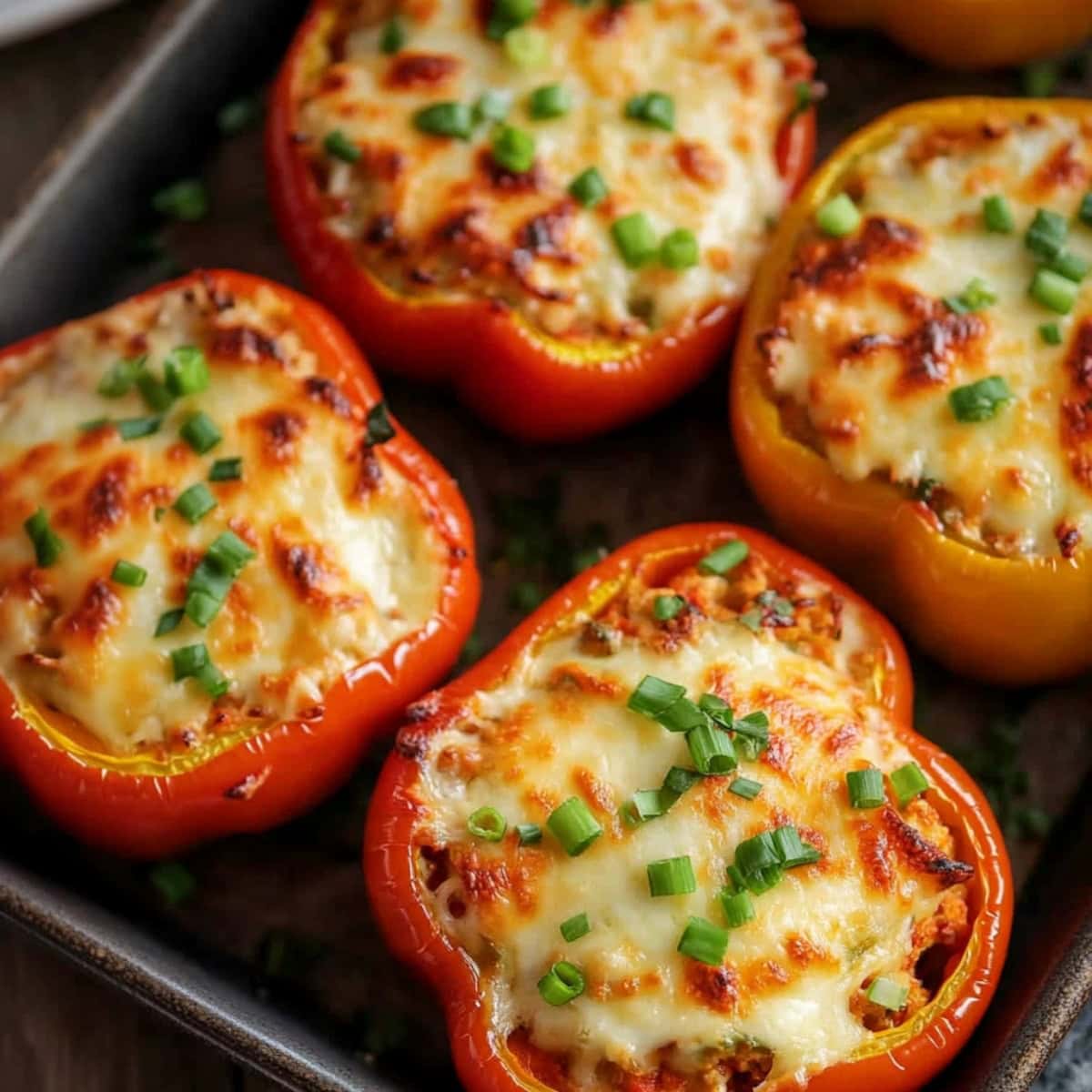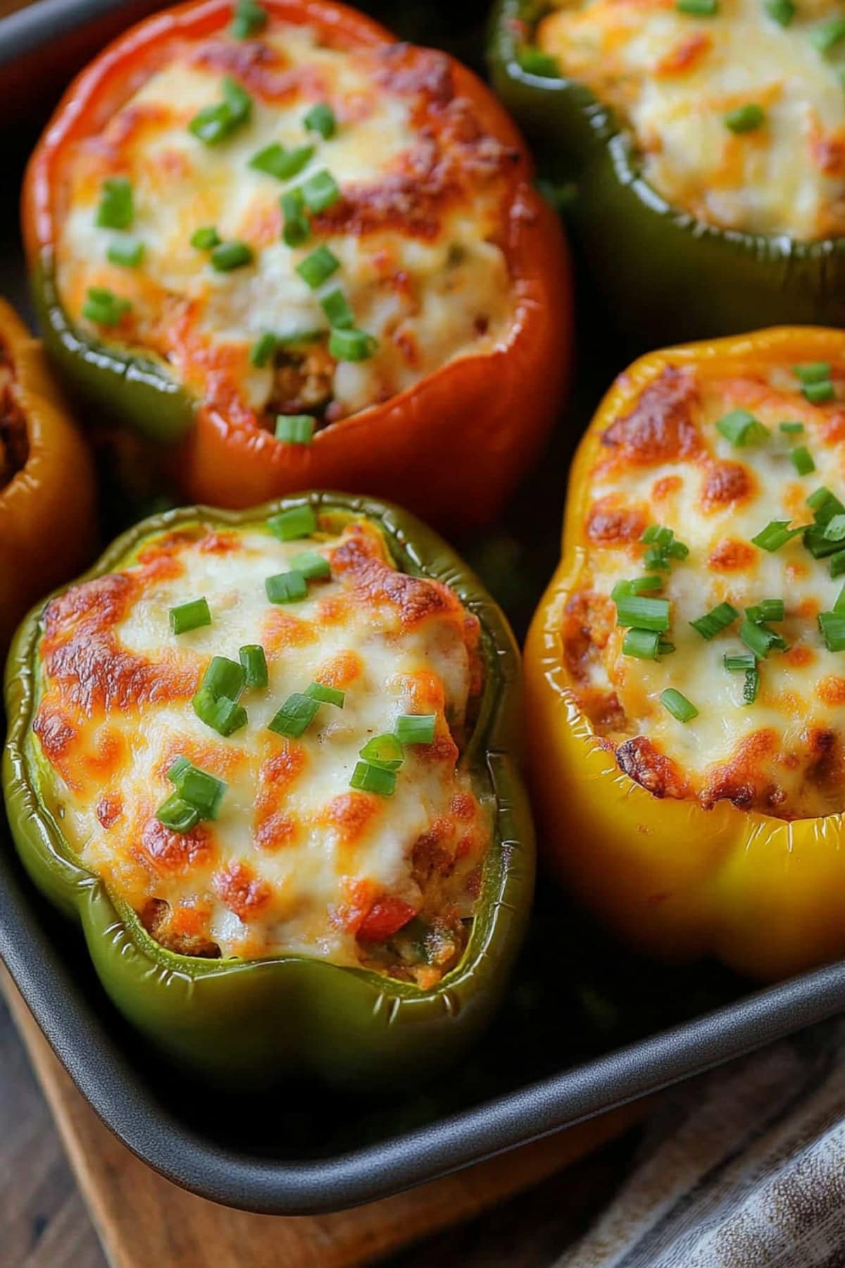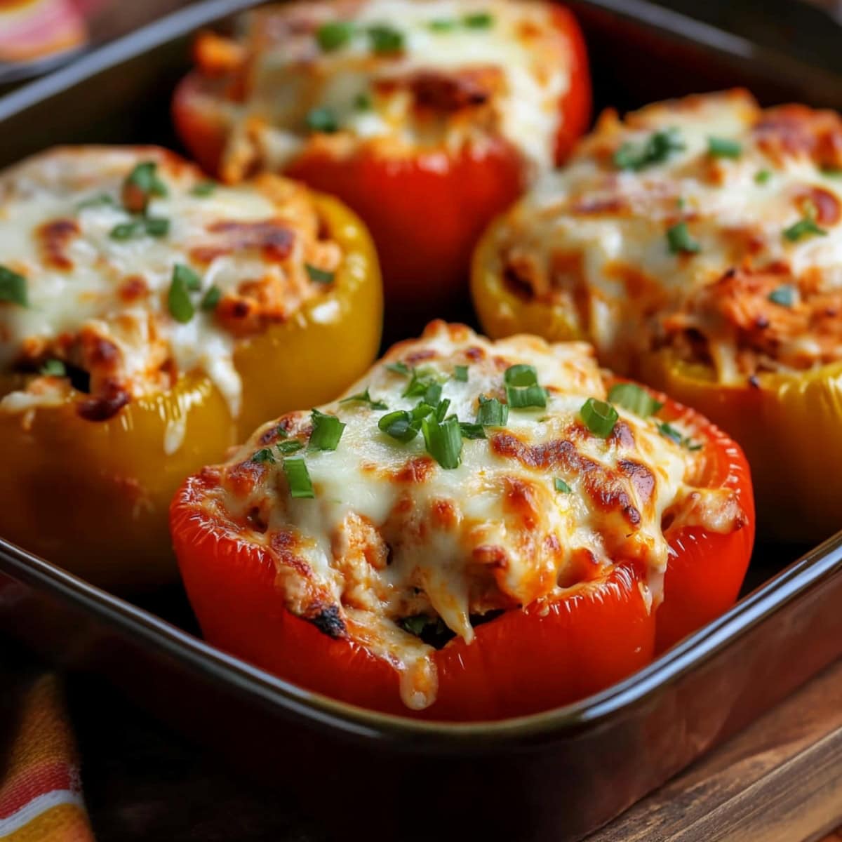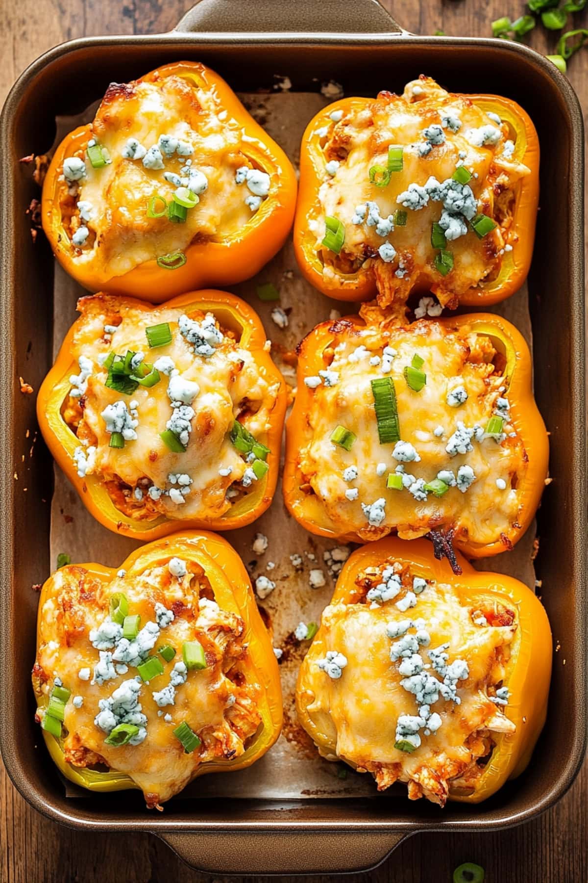 You can use any color bell peppers and even rotisserie chicken to save time. The mix of Buffalo sauce, cheese, and spices creates a mouthwatering filling. Top it all off with more cheese and green onions for a perfect meal or party snack.