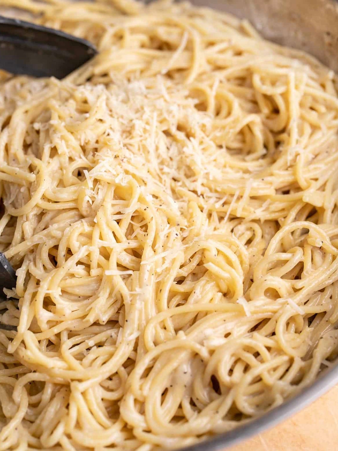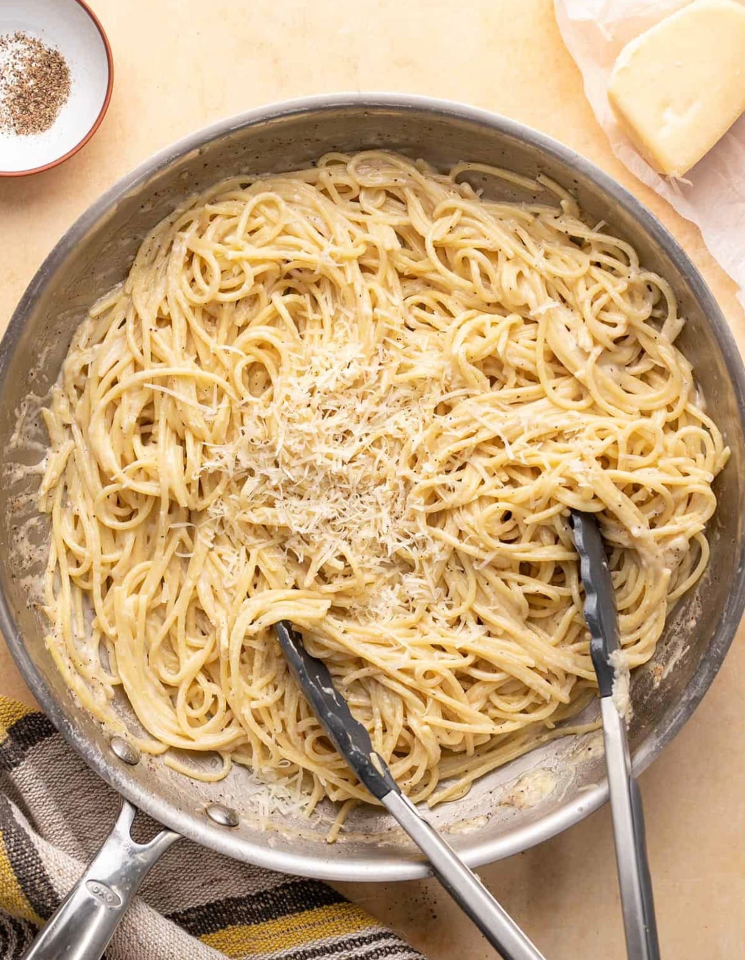 Toss the pasta quickly once you add it to the pan. This prevents the cheese from clumping and helps create a silky sauce that coats every strand of spaghetti.