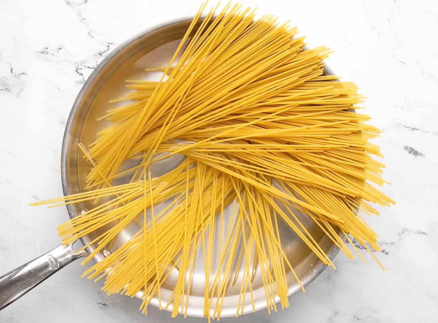 Boil 6 cups of water with 3/4 teaspoon salt in a big skillet. Add 1/2 pound of spaghetti and cook it for 2 minutes less than the package says.
