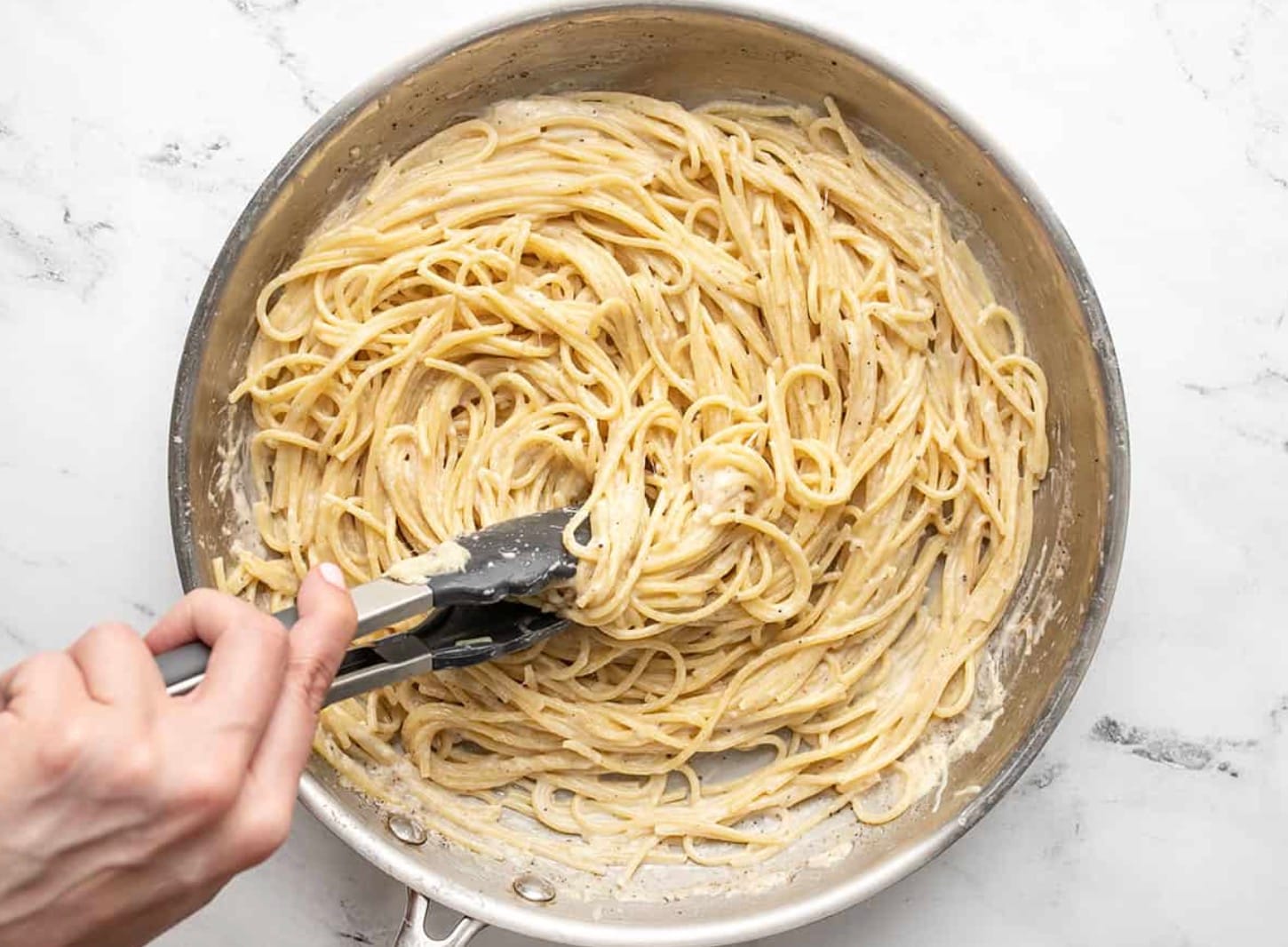 Use tongs to mix everything fast. Keep mixing until you get a creamy sauce coating the pasta.
