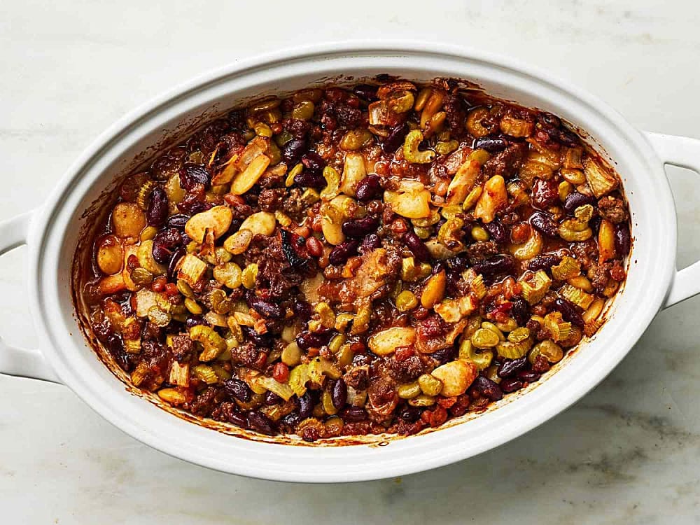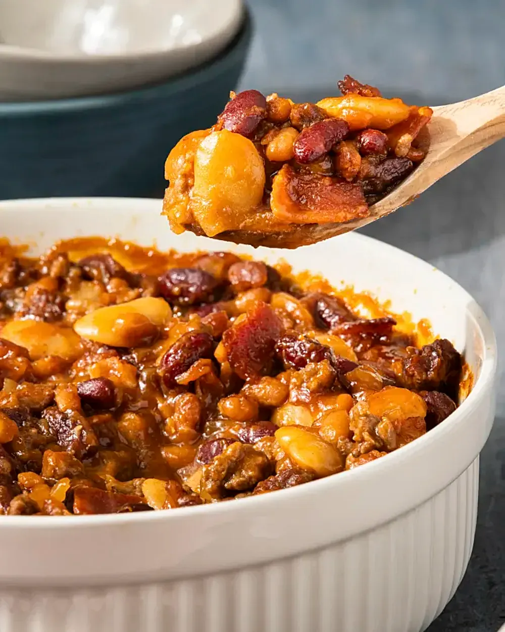 This hearty calico bean casserole combines three different beans with savory ground beef and crispy bacon in a sweet-tangy sauce that’s pure comfort food magic.