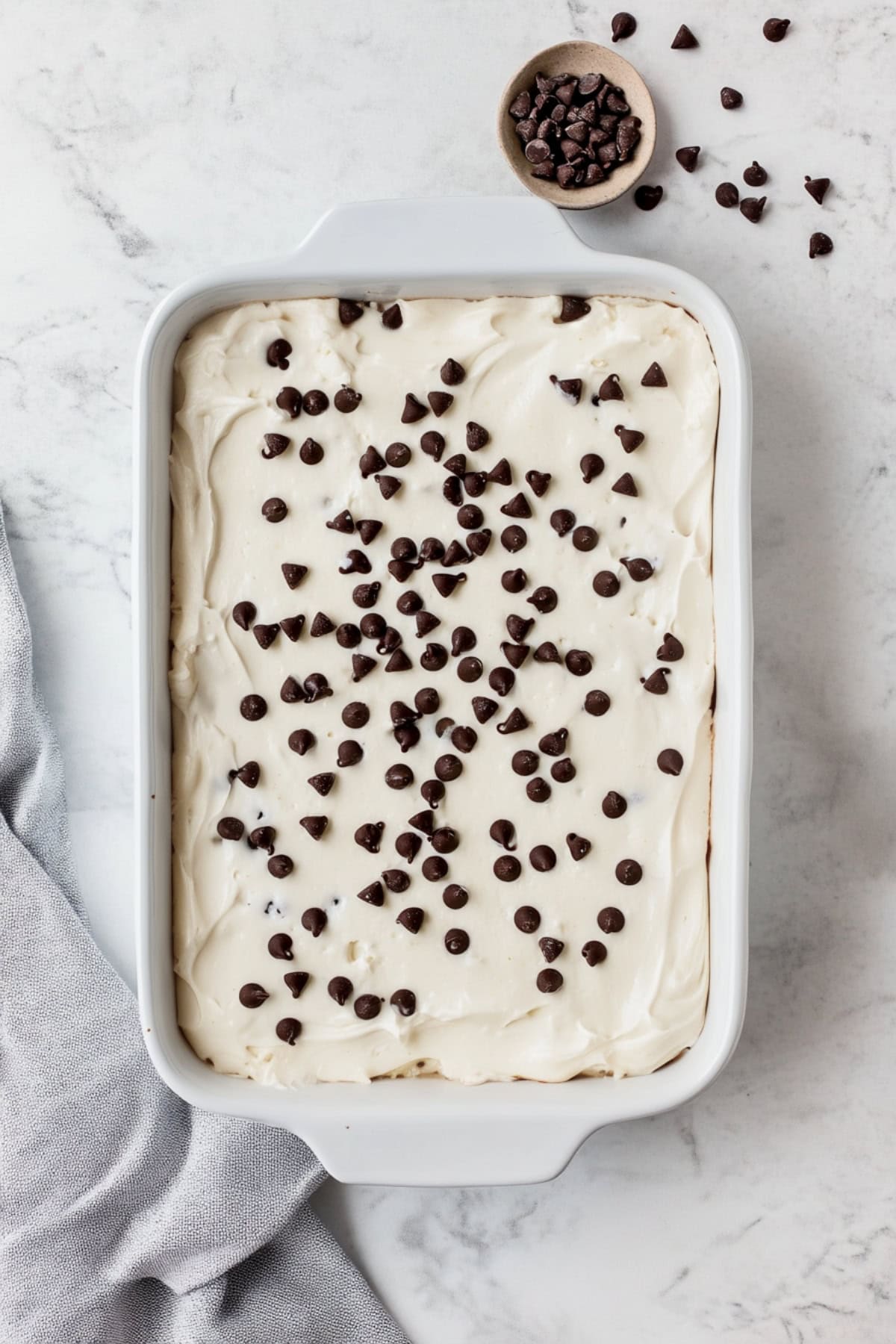 Sprinkle mini chocolate chips over the top. They’ll stick to the creamy topping.