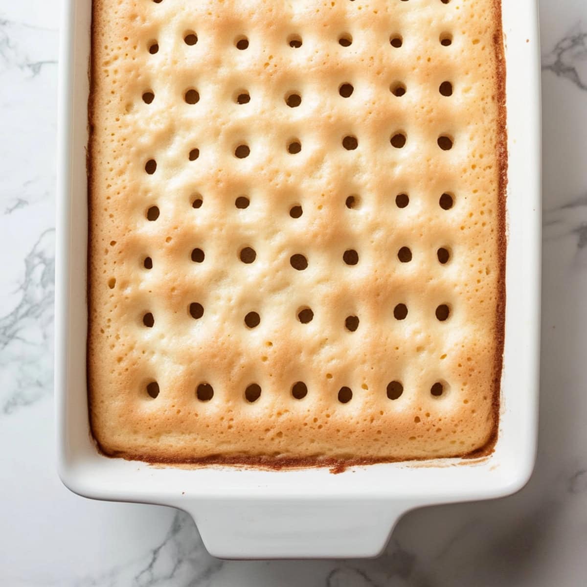 Don’t skip poking the holes! They allow the sweetened condensed milk to soak in, making the cake extra moist.