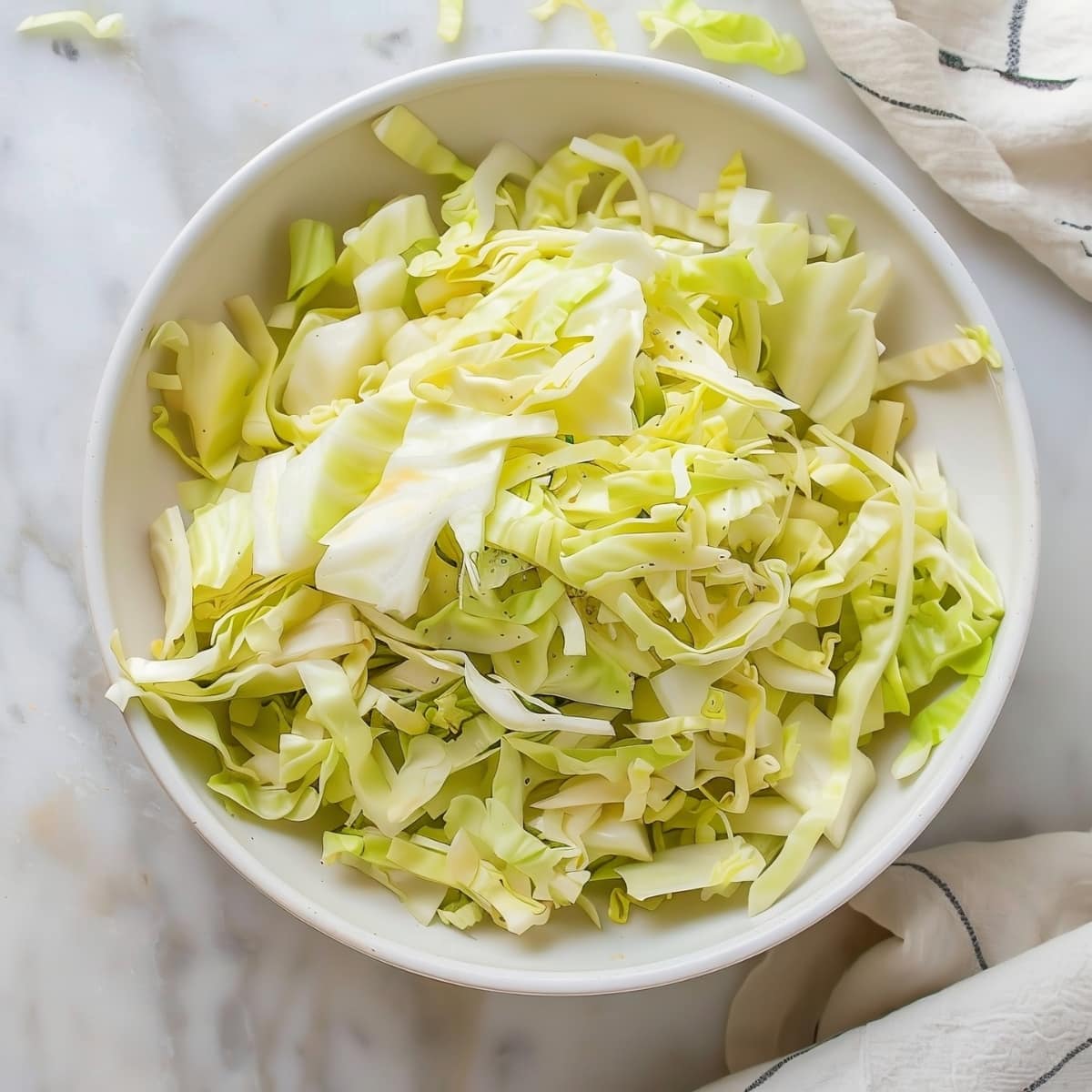 Start by prepping your cabbage. Remove the outer leaves, cut it into quarters, and slice each quarter into thin strips. Discard the core.