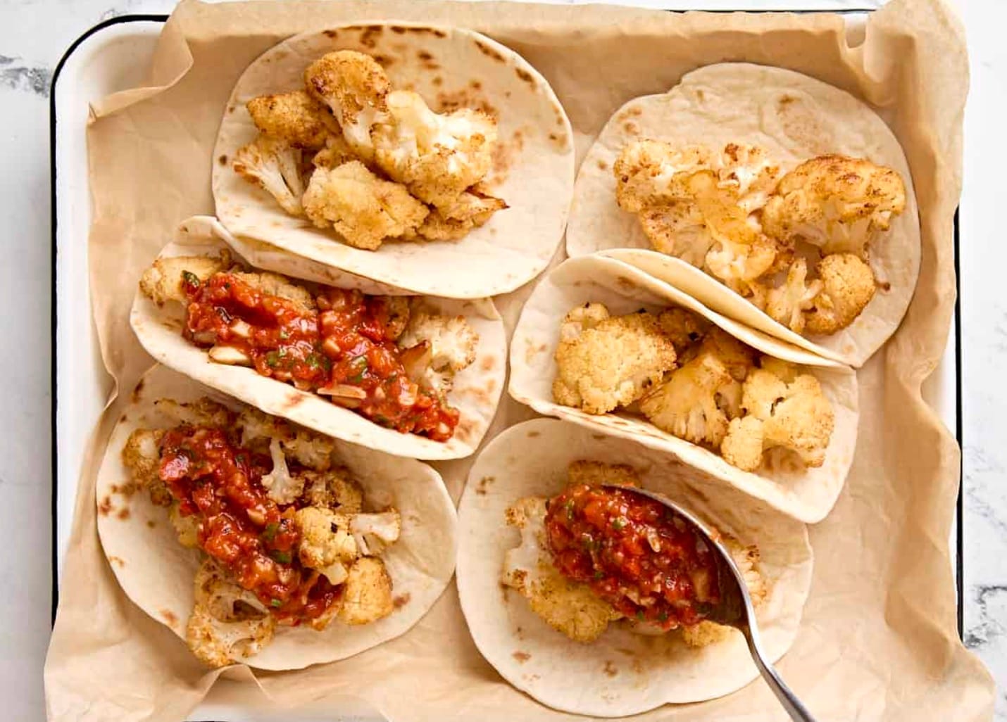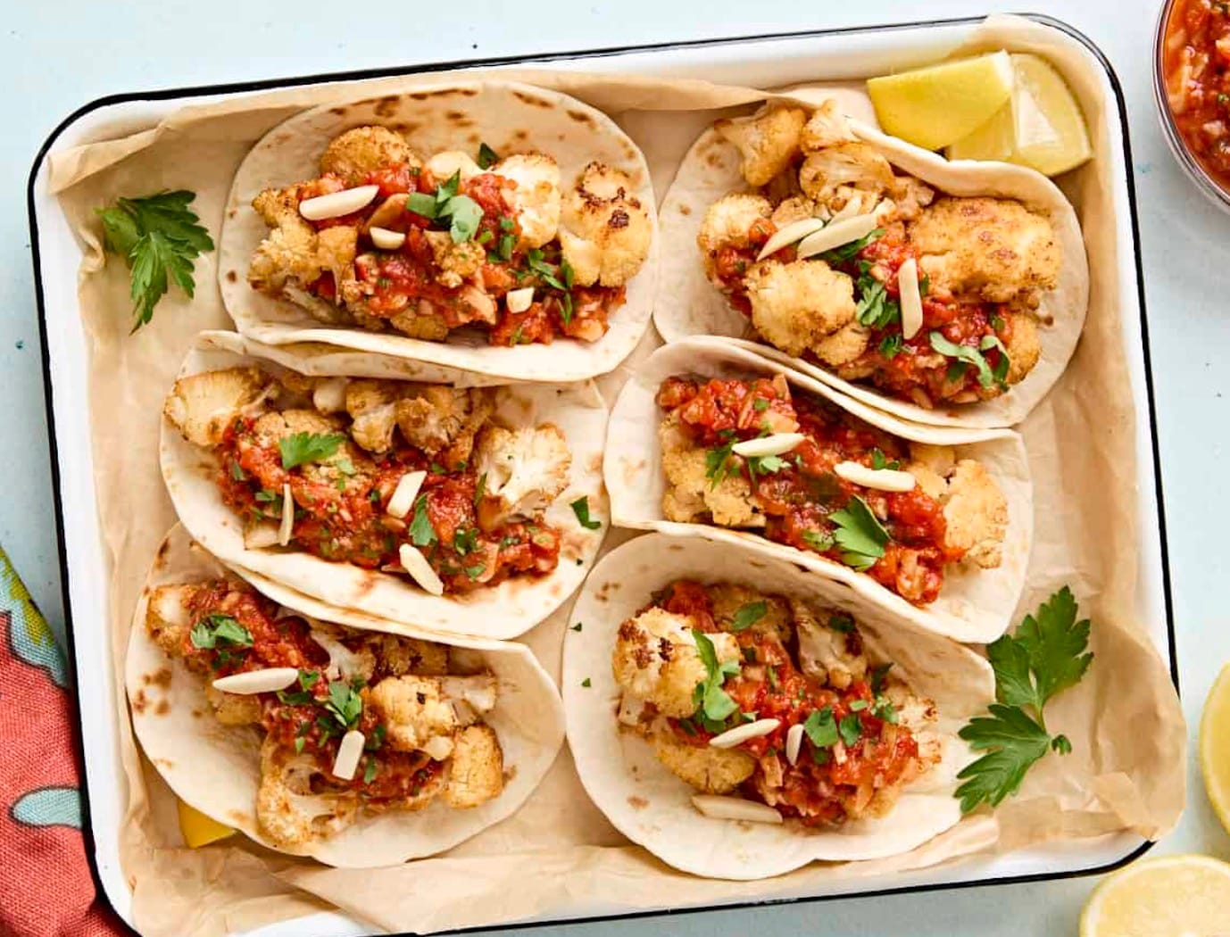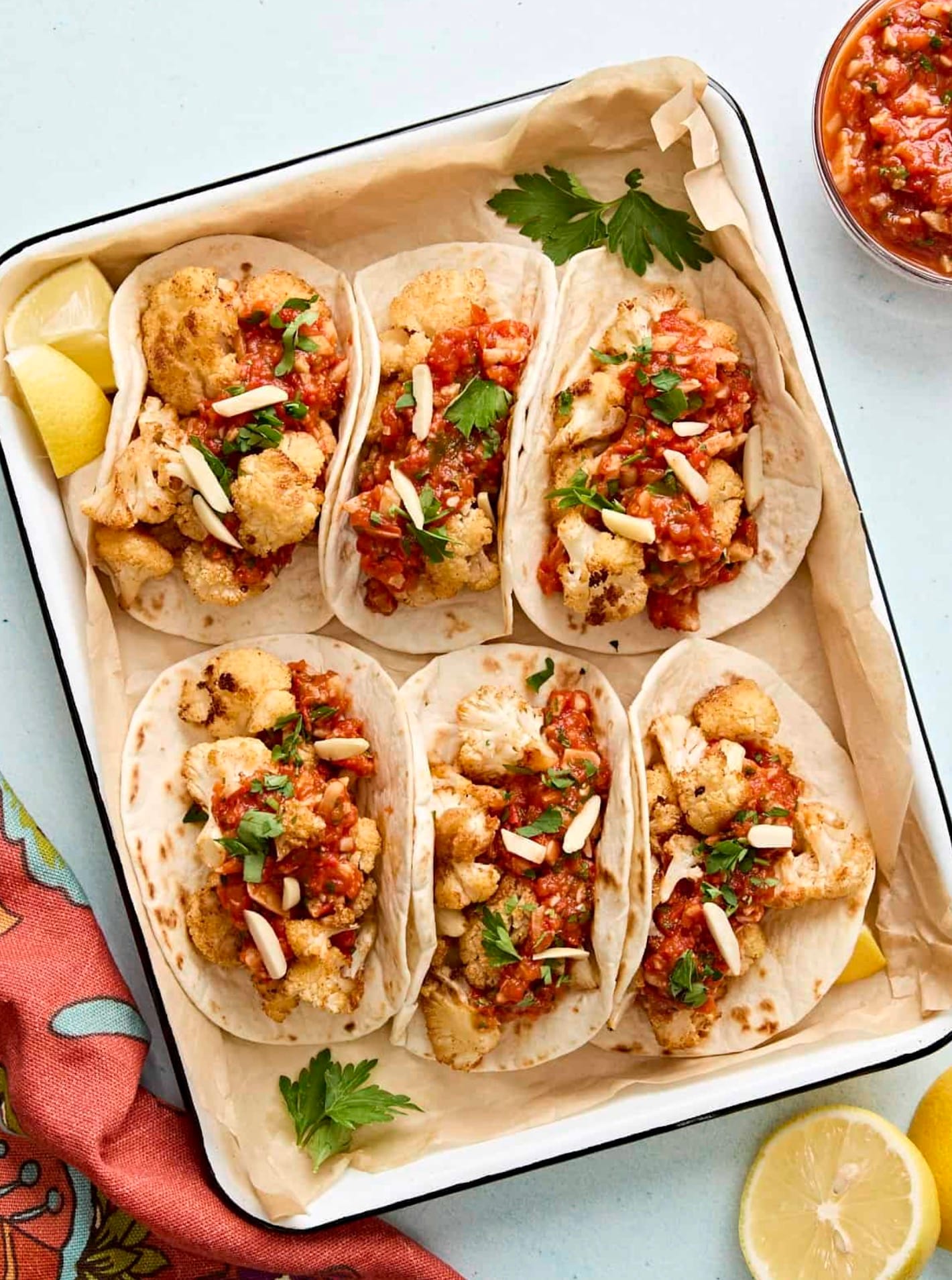 To serve, place 3-4 cauliflower florets on each tortilla. Top with warm Romesco sauce. Sprinkle with fresh parsley and almonds if you like.