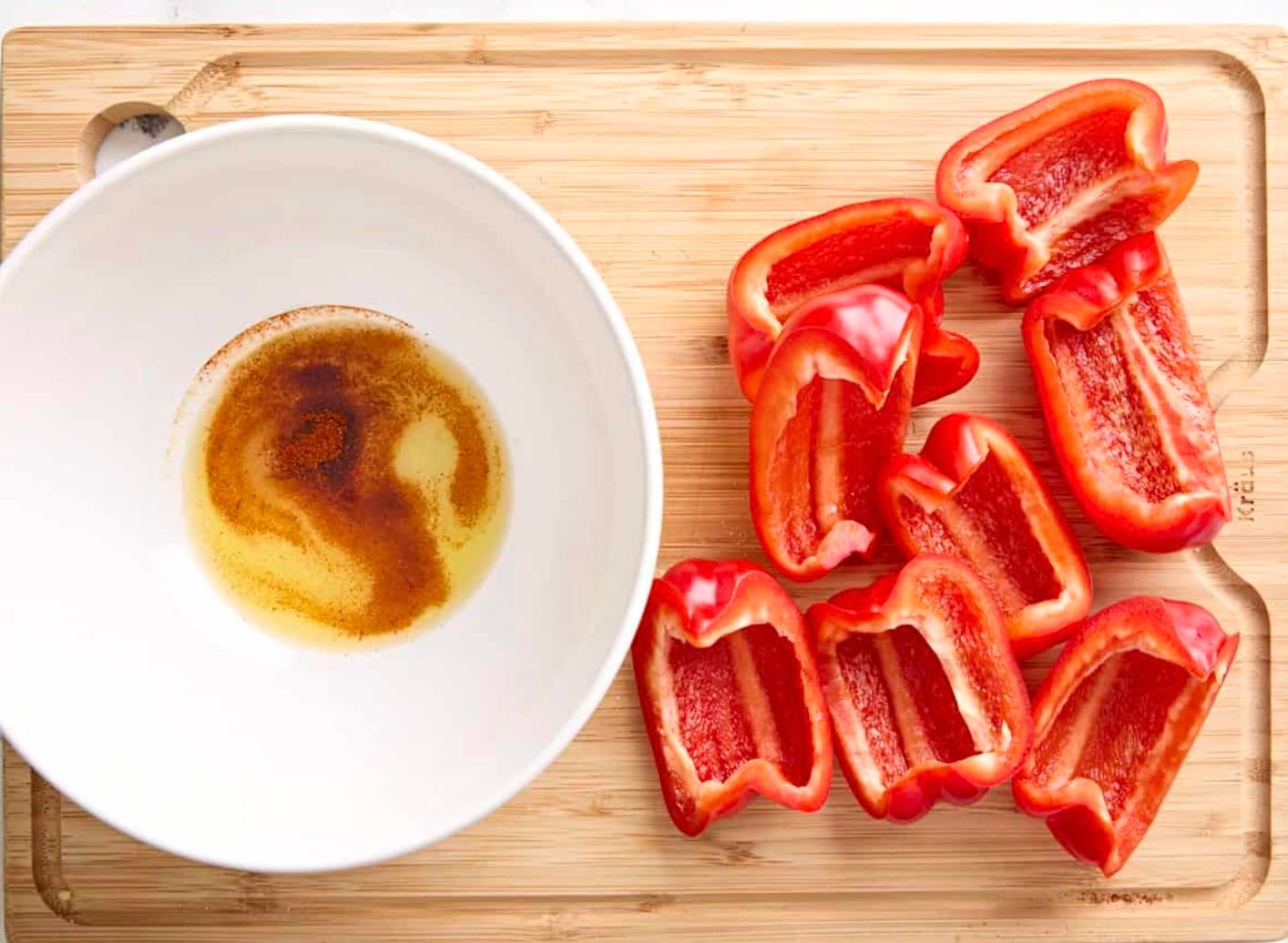 Quarter and seed the red bell peppers. In a bowl, mix 1 tablespoon olive oil, 1/4 teaspoon smoked paprika, garlic powder, and salt. Toss the peppers in this mixture.