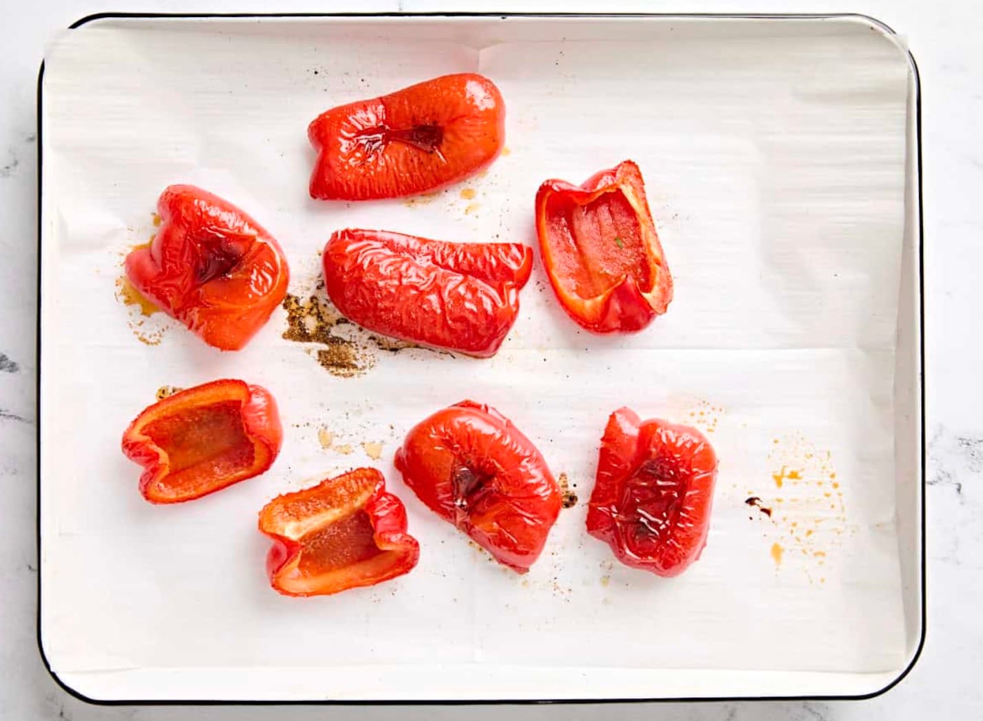 Place the seasoned peppers on a baking sheet. Roast them on the top rack for 35-40 minutes.