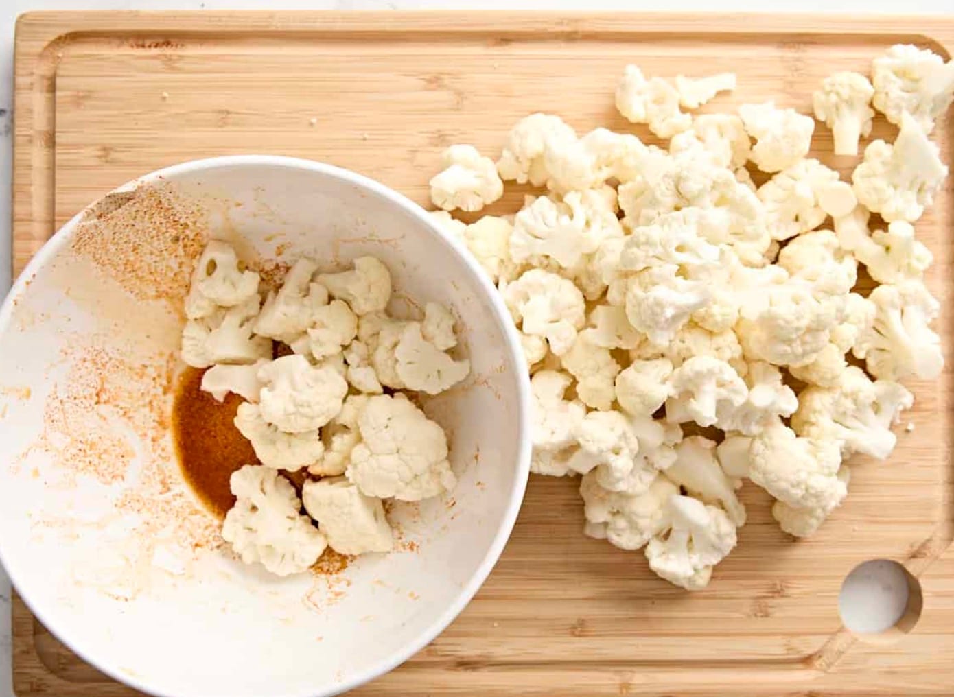 Preheat your oven to 375°F (190°C). Cut the cauliflower into bite-sized florets and set aside.