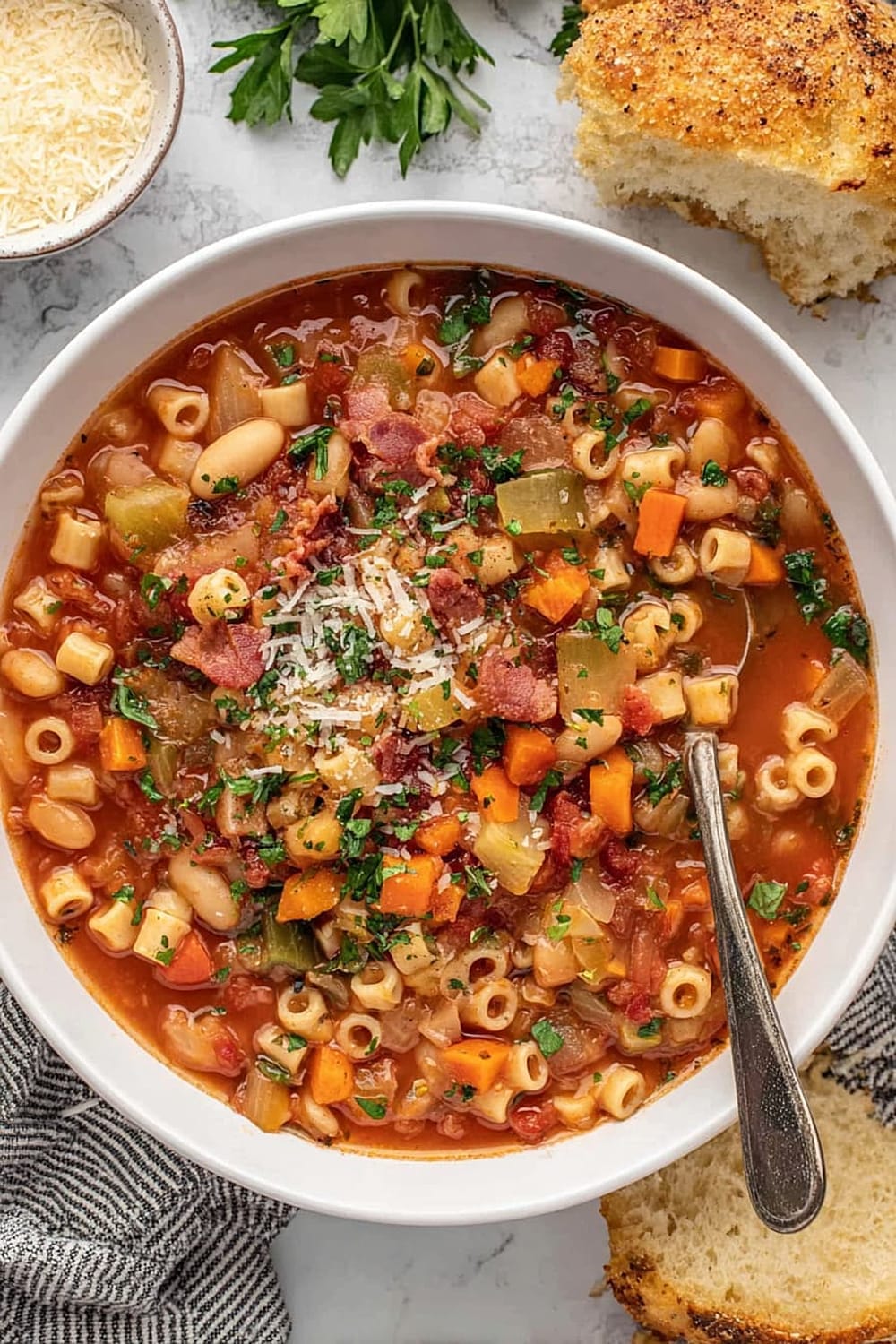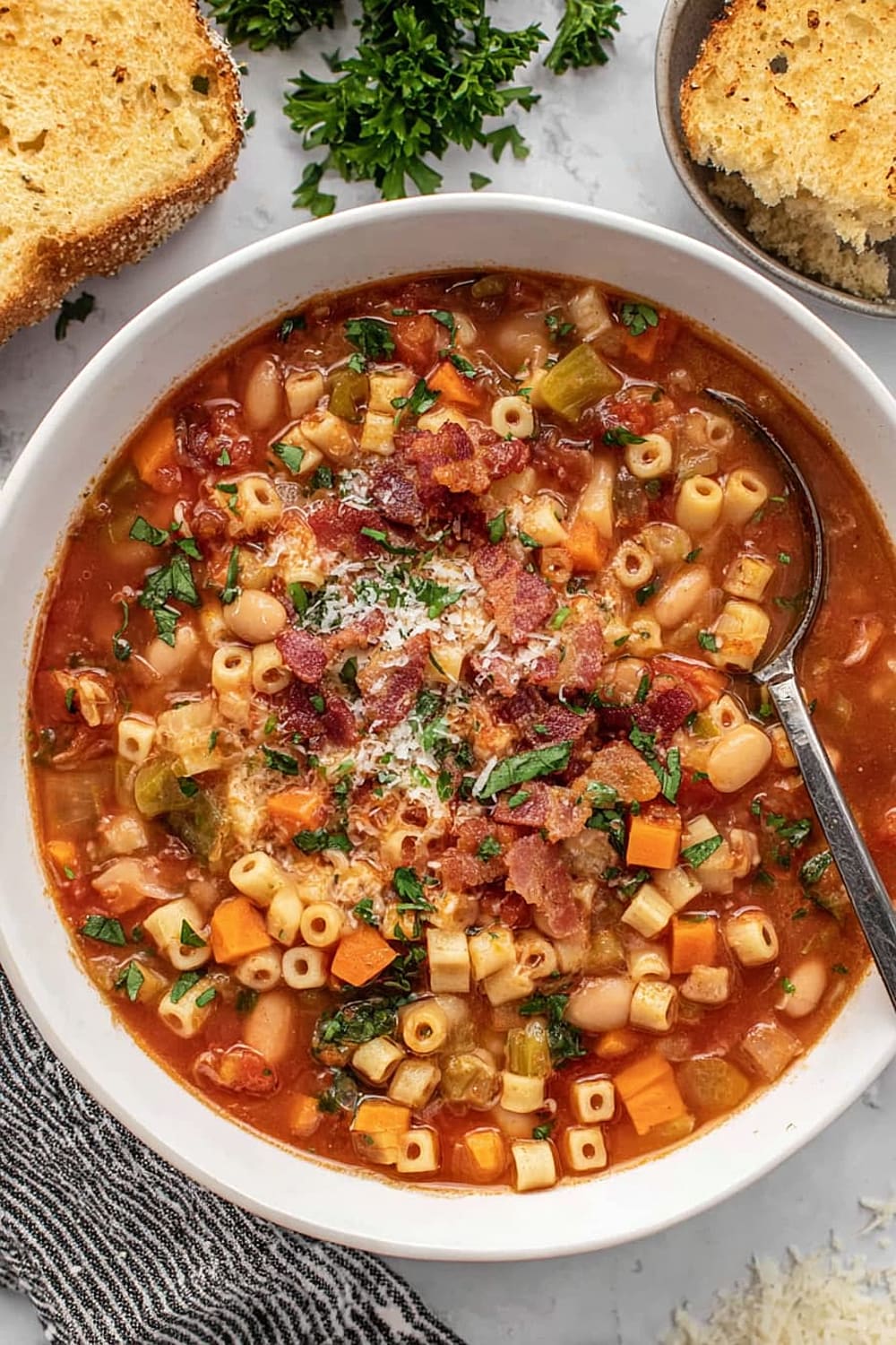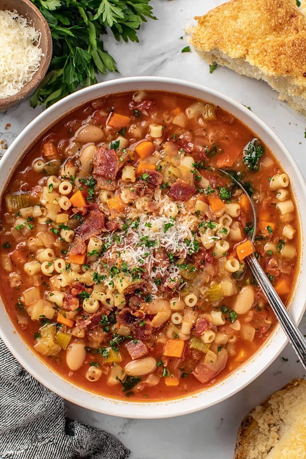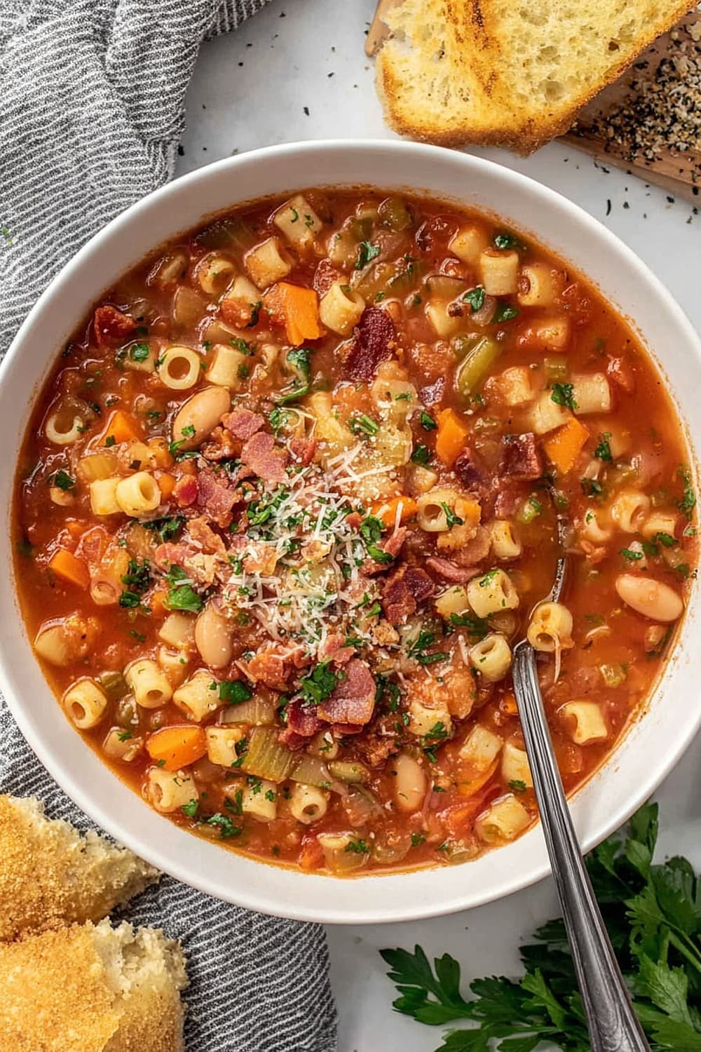 Don’t skip the bacon fat – it’s not just grease, it’s flavor foundation. Stir pasta frequently during cooking to prevent sticking and ensure even cooking throughout. Add pasta directly to soup rather than cooking separately; this allows the pasta to absorb the seasoned broth for maximum flavor integration. Control your heat – vigorous boiling can break down beans and make pasta mushy.
