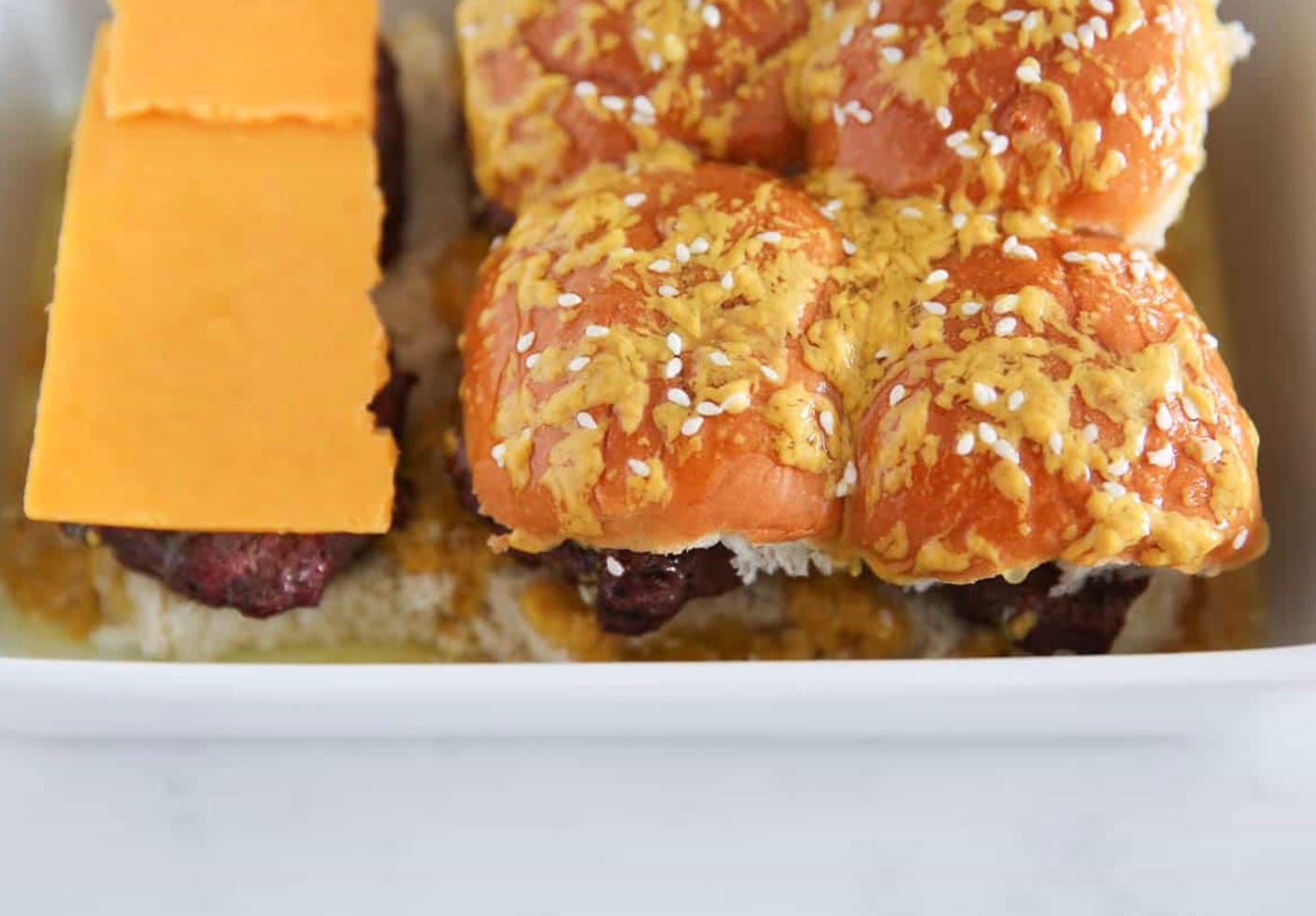 Pour the prepared sauce over the sliders. Let it soak in for 10 minutes. Cover with foil and bake for 10-15 minutes. Uncover and bake 2 more minutes to brown the tops.