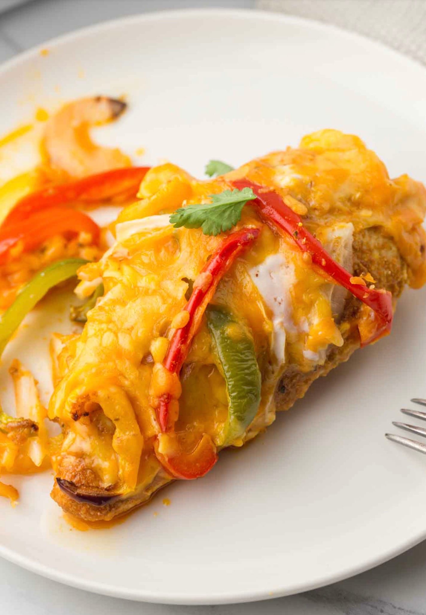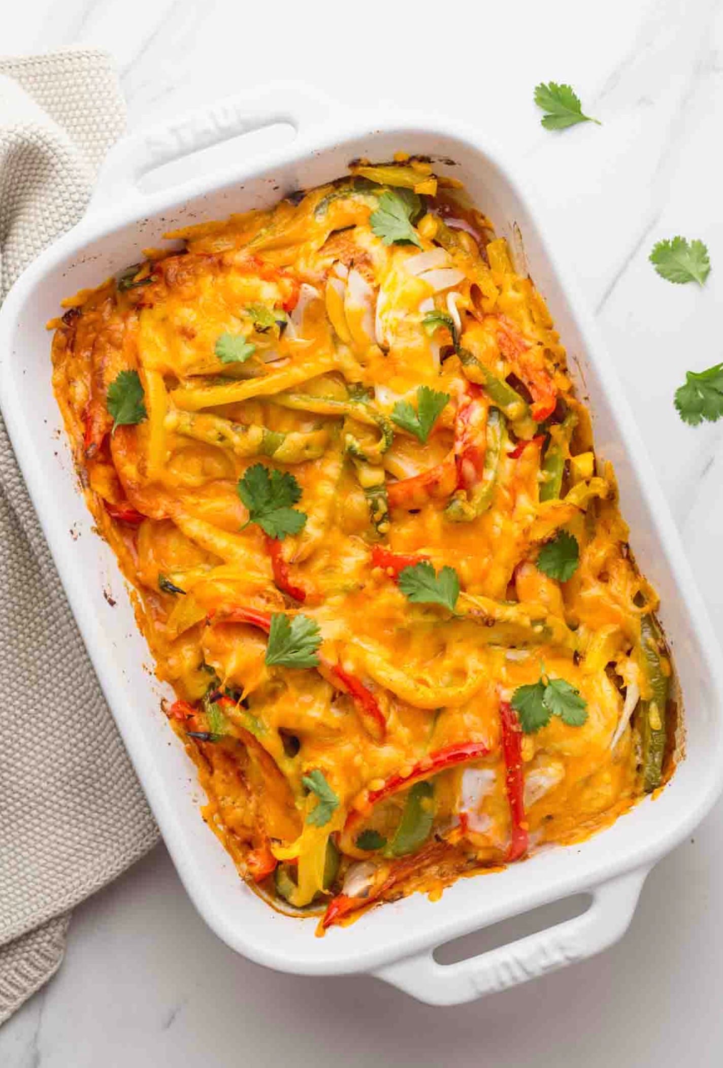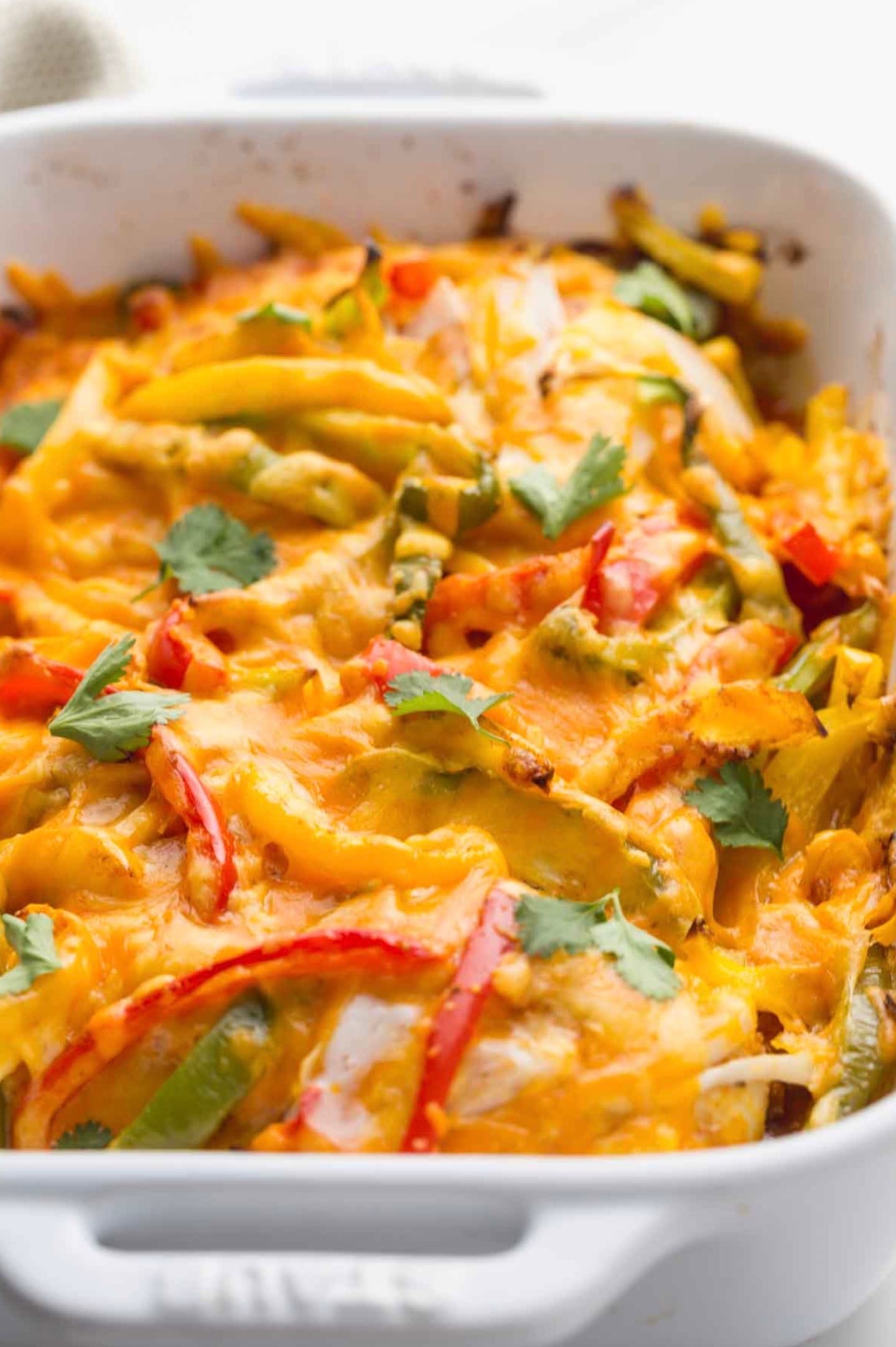 Before serving, sprinkle some fresh cilantro on top if you like. Your cheesy chicken fajita casserole is ready to eat! Enjoy your tasty, one-dish meal.