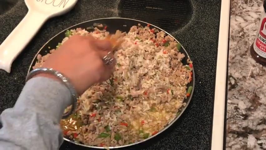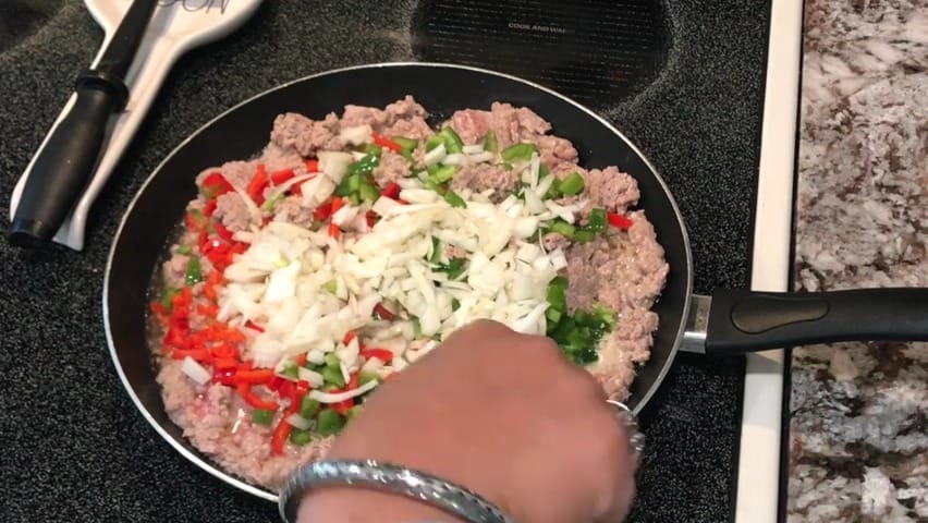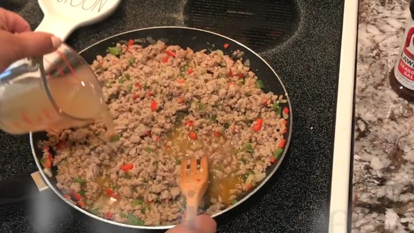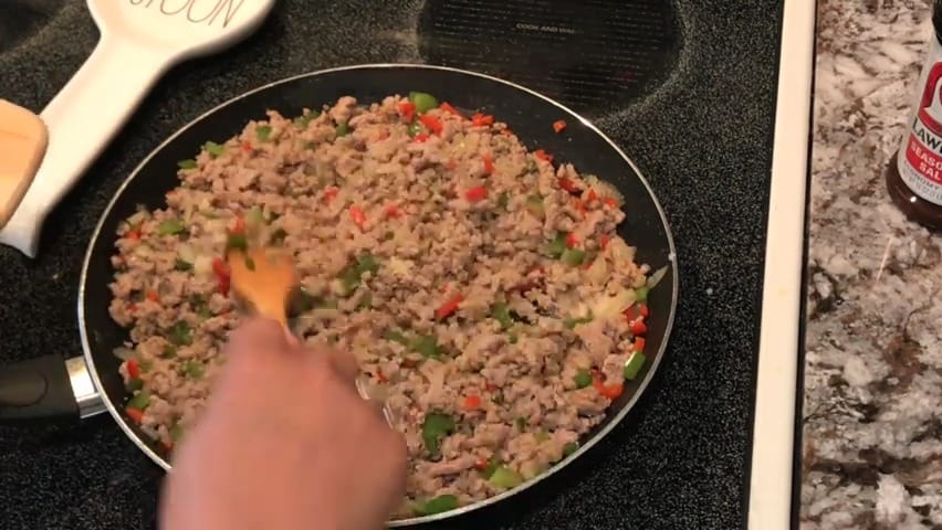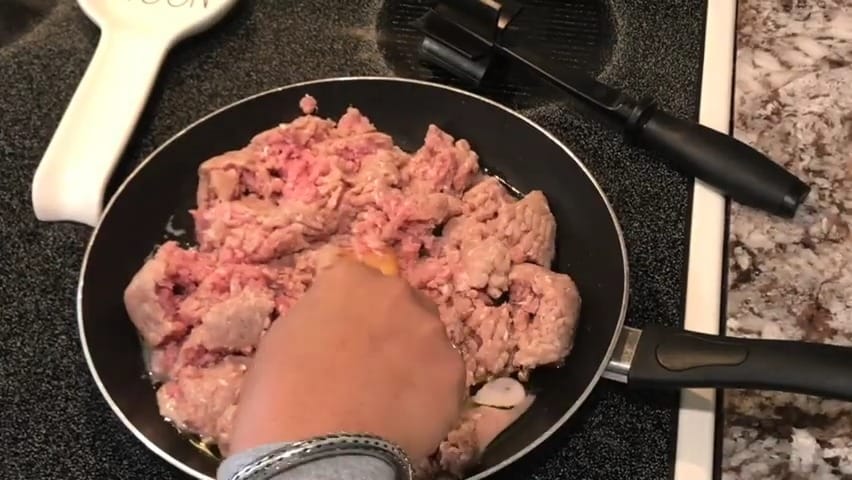 Add ground turkey (or beef) to the skillet.