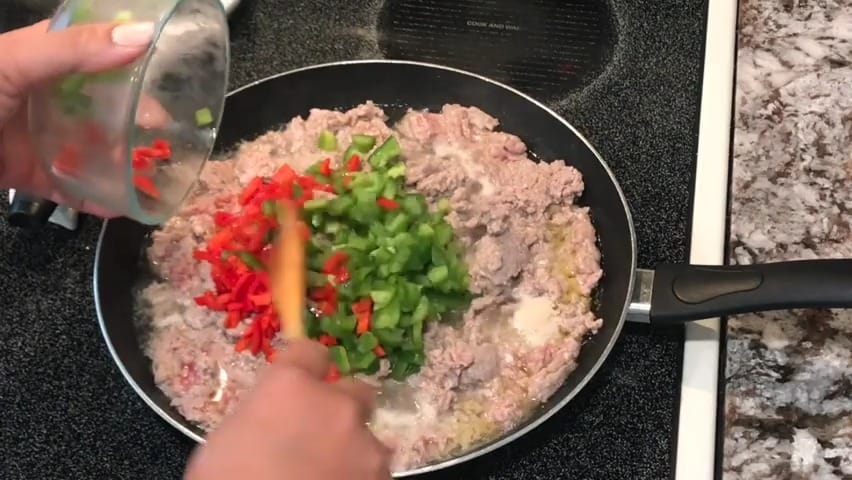 Add chopped green bell pepper and red bell peppers to the skillet.