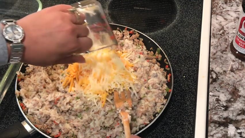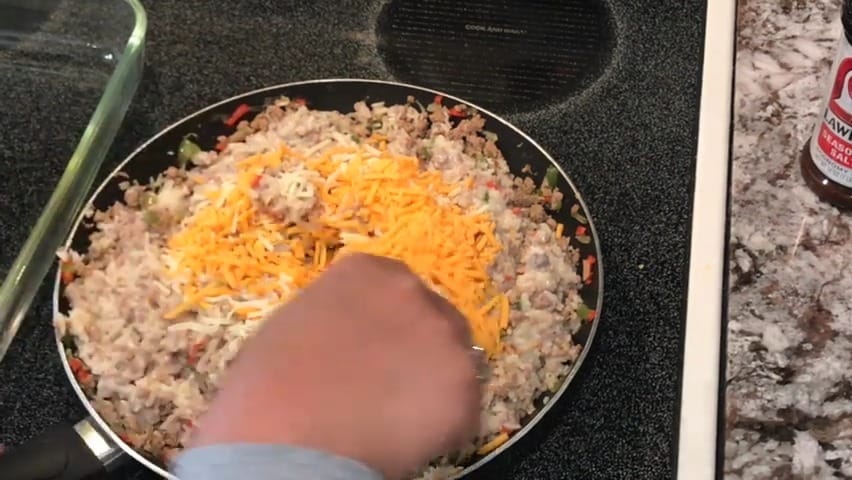 Add 1 ½ cups of shredded cheddar cheese to the skillet.