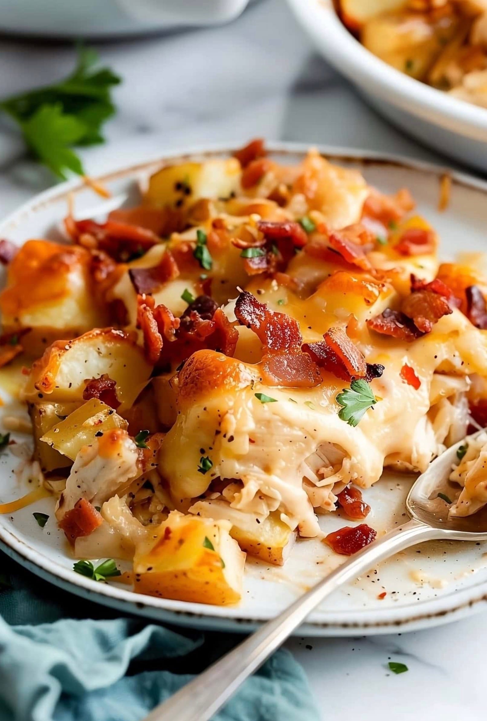 The recipe is simple to follow. You’ll start by seasoning cubed chicken and potatoes with a mix of spices. Then you’ll bake the potatoes before adding the chicken. At the end, you’ll top it with bacon and cheese for a gooey, delicious finish. Your family will love this hearty meal!